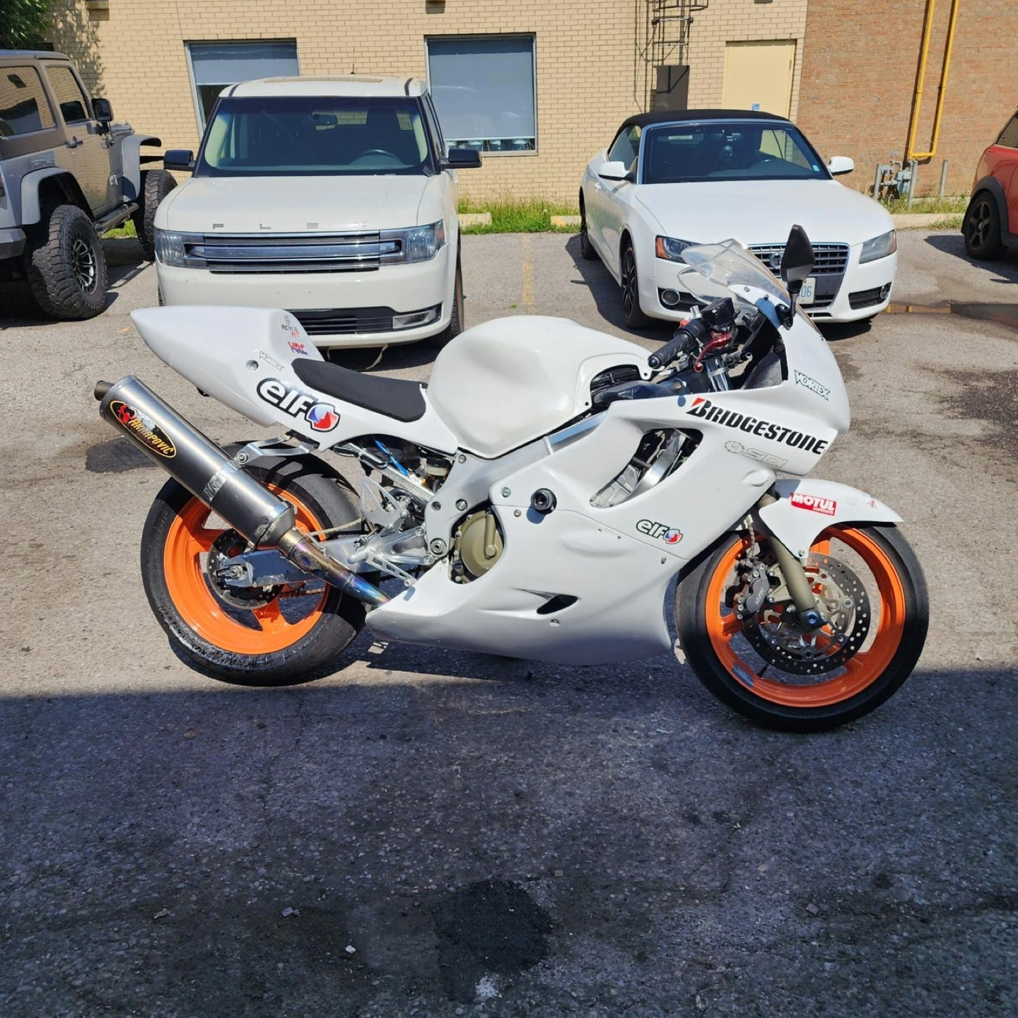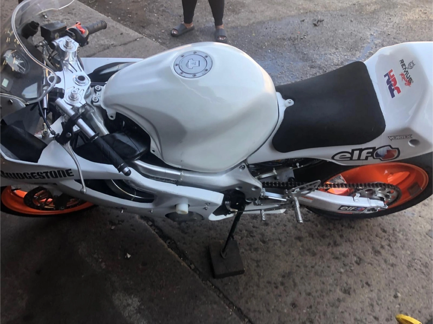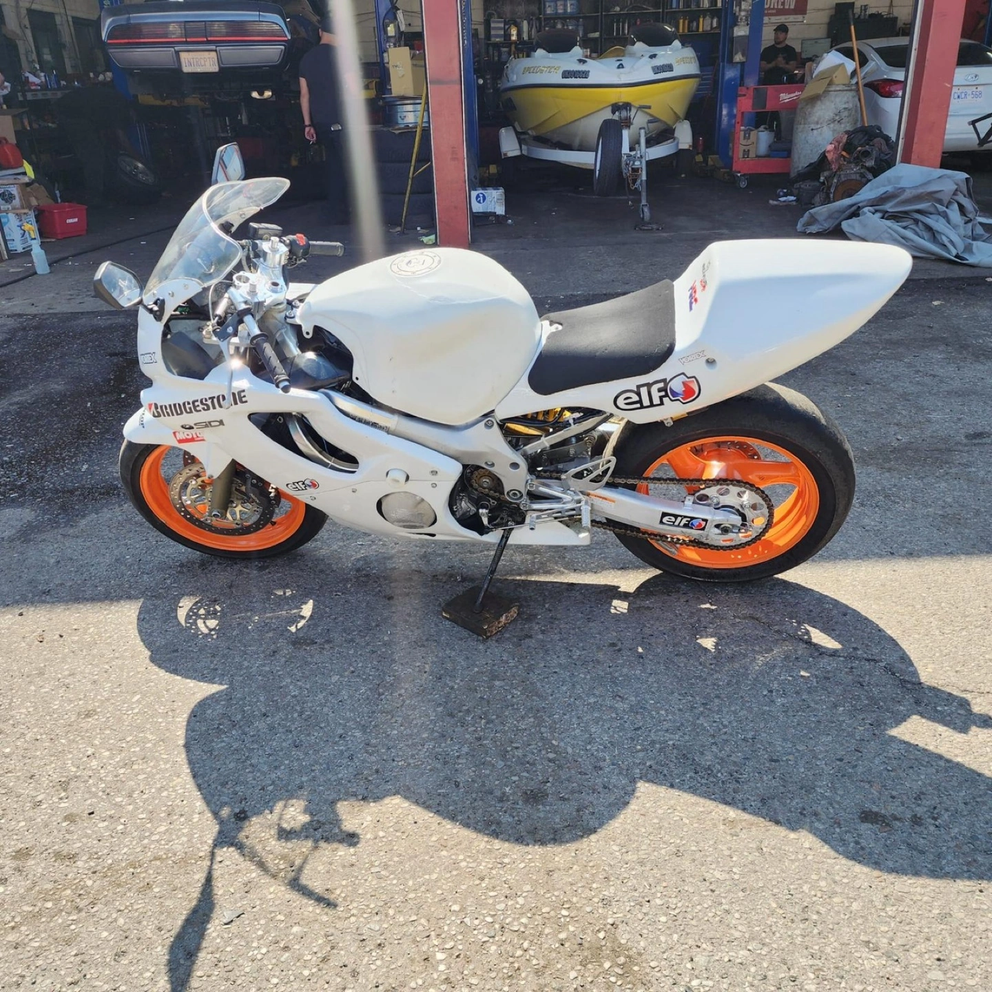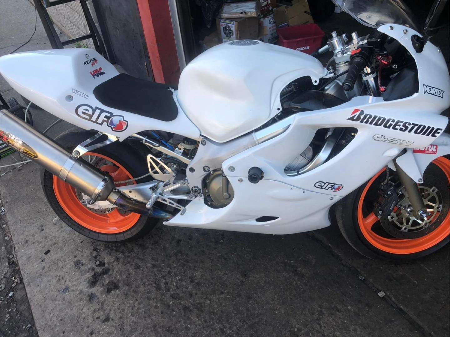 White Honda CBR600 F4i track motorcycle. Aftermarket exhaust. Orange rims. Bridgestone tires. Elf logos. Vortex parts.