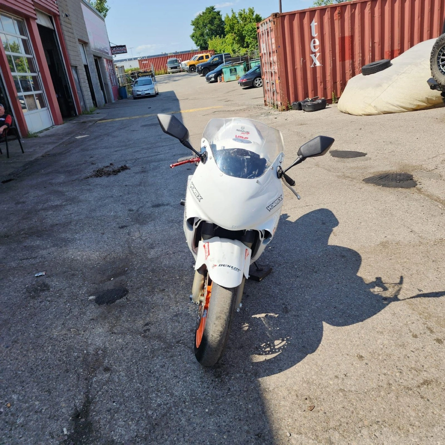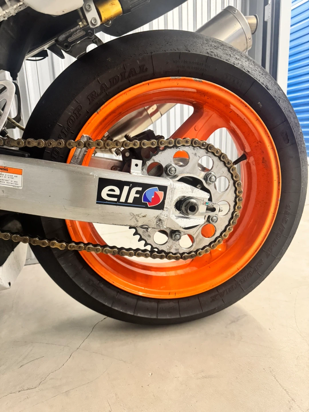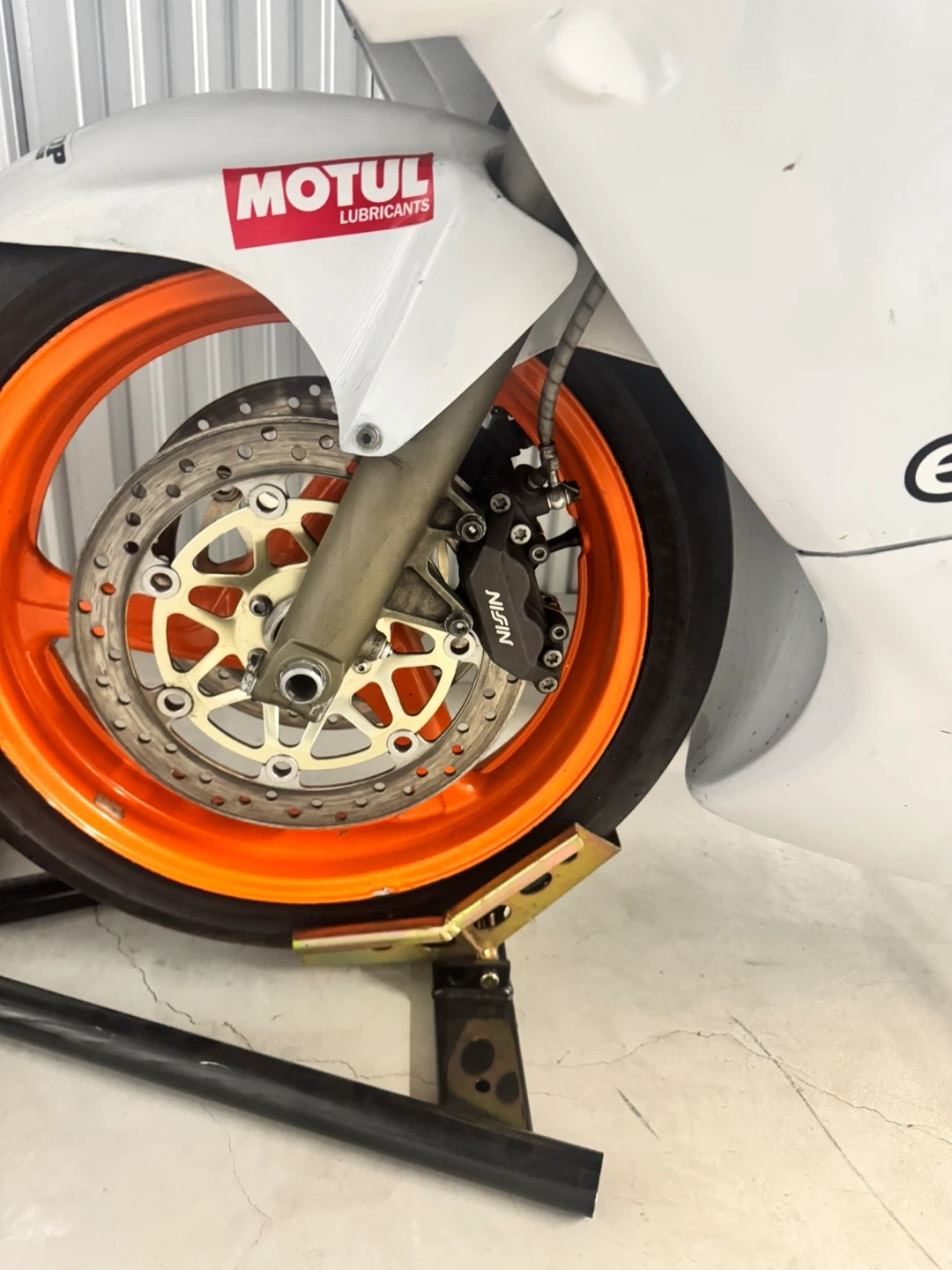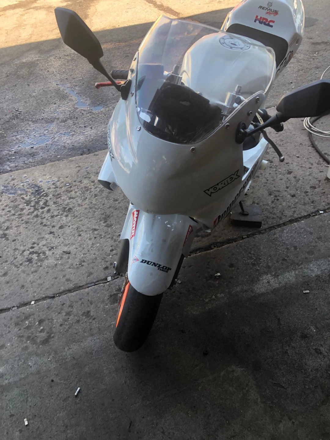 White Honda CBR600 F4i track motorcycle. Aftermarket exhaust. Orange rims. Bridgestone tires. Elf logos. Vortex parts.
