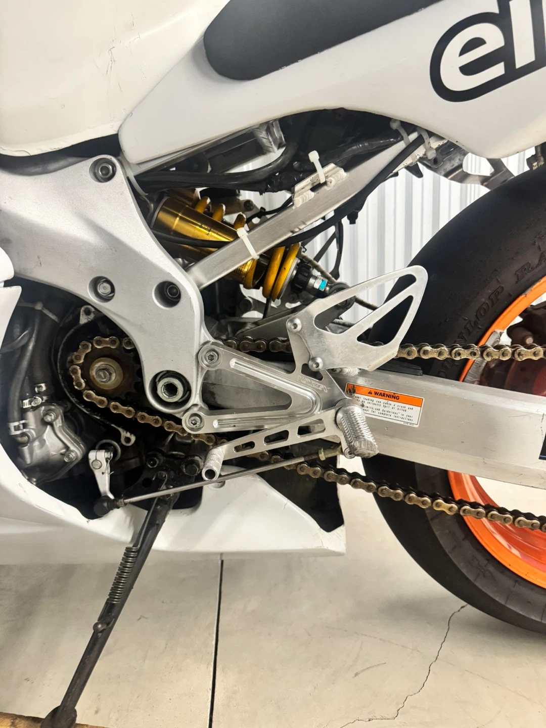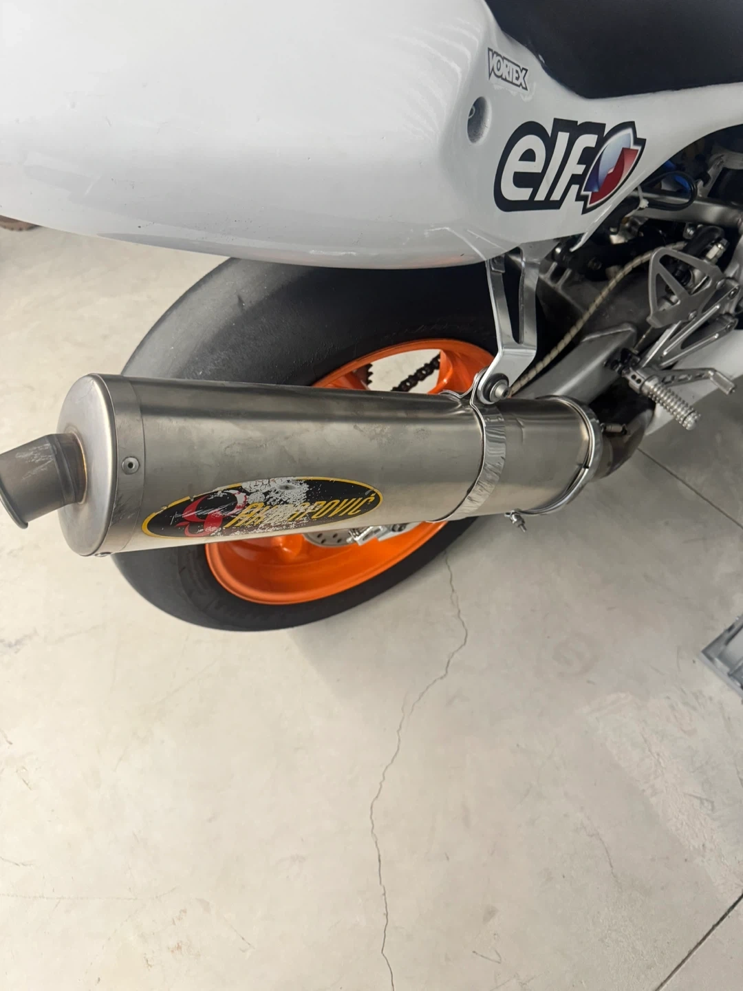 White Honda CBR600 F4i track motorcycle. Aftermarket exhaust. Orange rims. Bridgestone tires. Elf logos. Vortex parts.