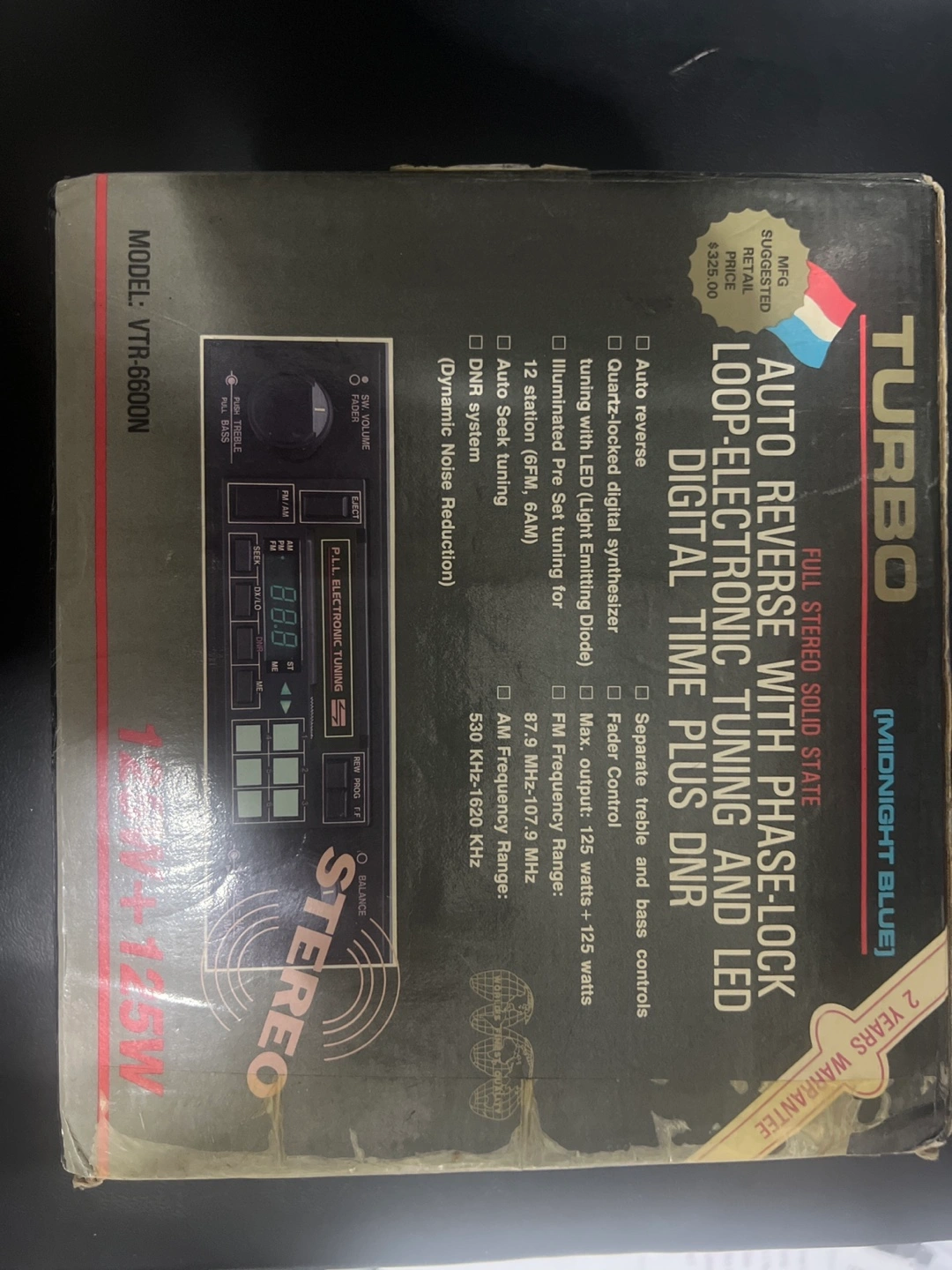 New in box, vintage car stereo. Midnight blue. Features auto reverse, digital time, and DNR system. Includes LED display. Quartz-locked digital synthesizer. Fits into dash. 12 station tuning.