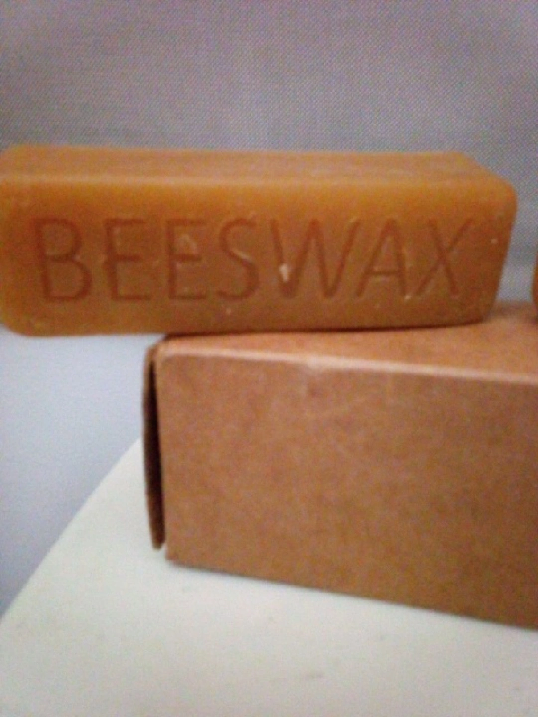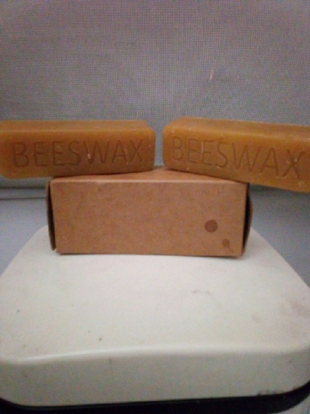Two blocks of beeswax in a small cardboard box. Great for candles, lip balm, for skateboarding or other crafting projects.