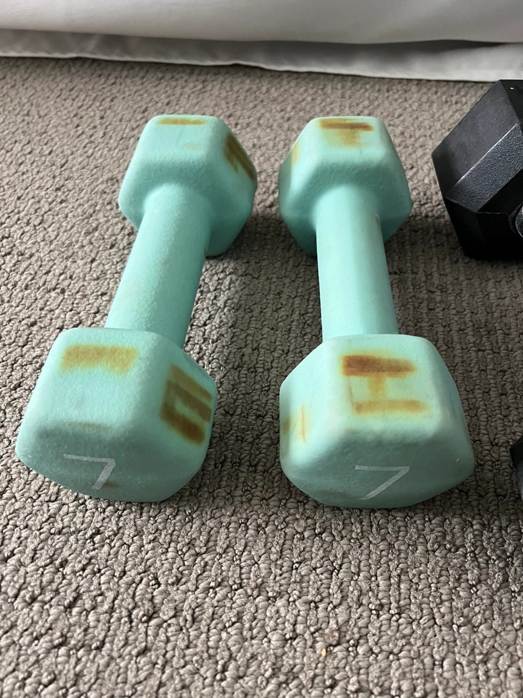 Closet clear out: Two pairs of dumbbells for sale. One pair is 7lb light teal, the other is 10lb black. Used only a handful of times. Marks on the 7’s are from stacking on top of the 10’s. $15 for both pairs together