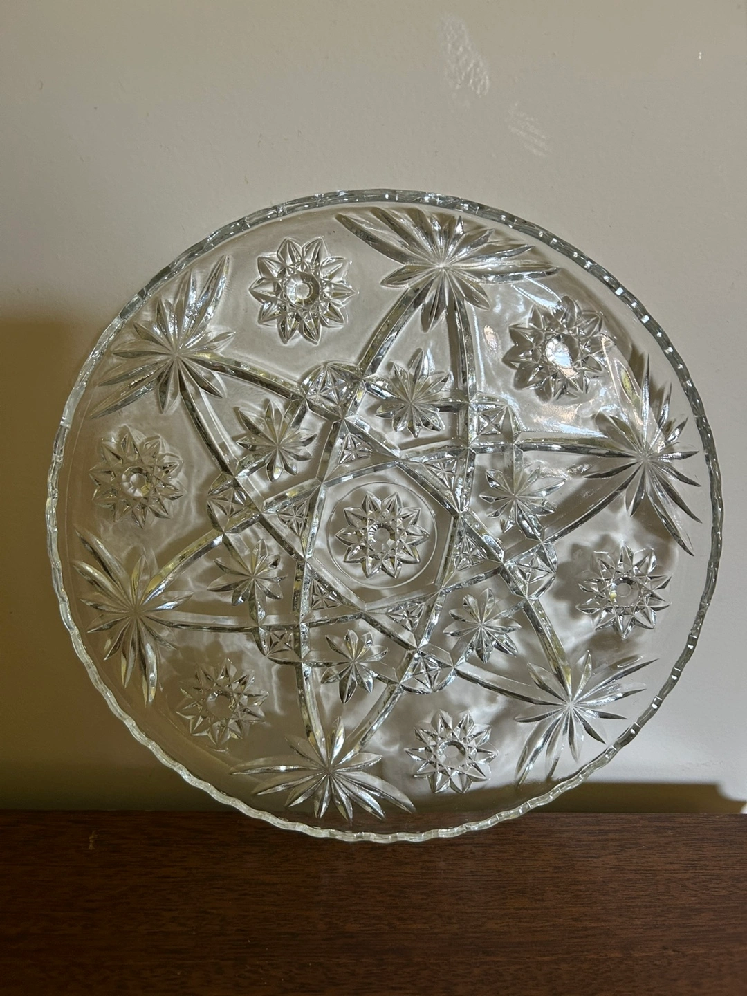 Beautiful vintage glass plate. Intricate starburst design. Clear glass. Perfect for serving or display.