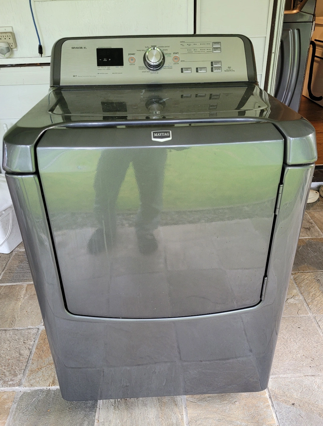 Maytag Bravos XL electric dryer. Dark grey colour. Features many drying cycles and options.
