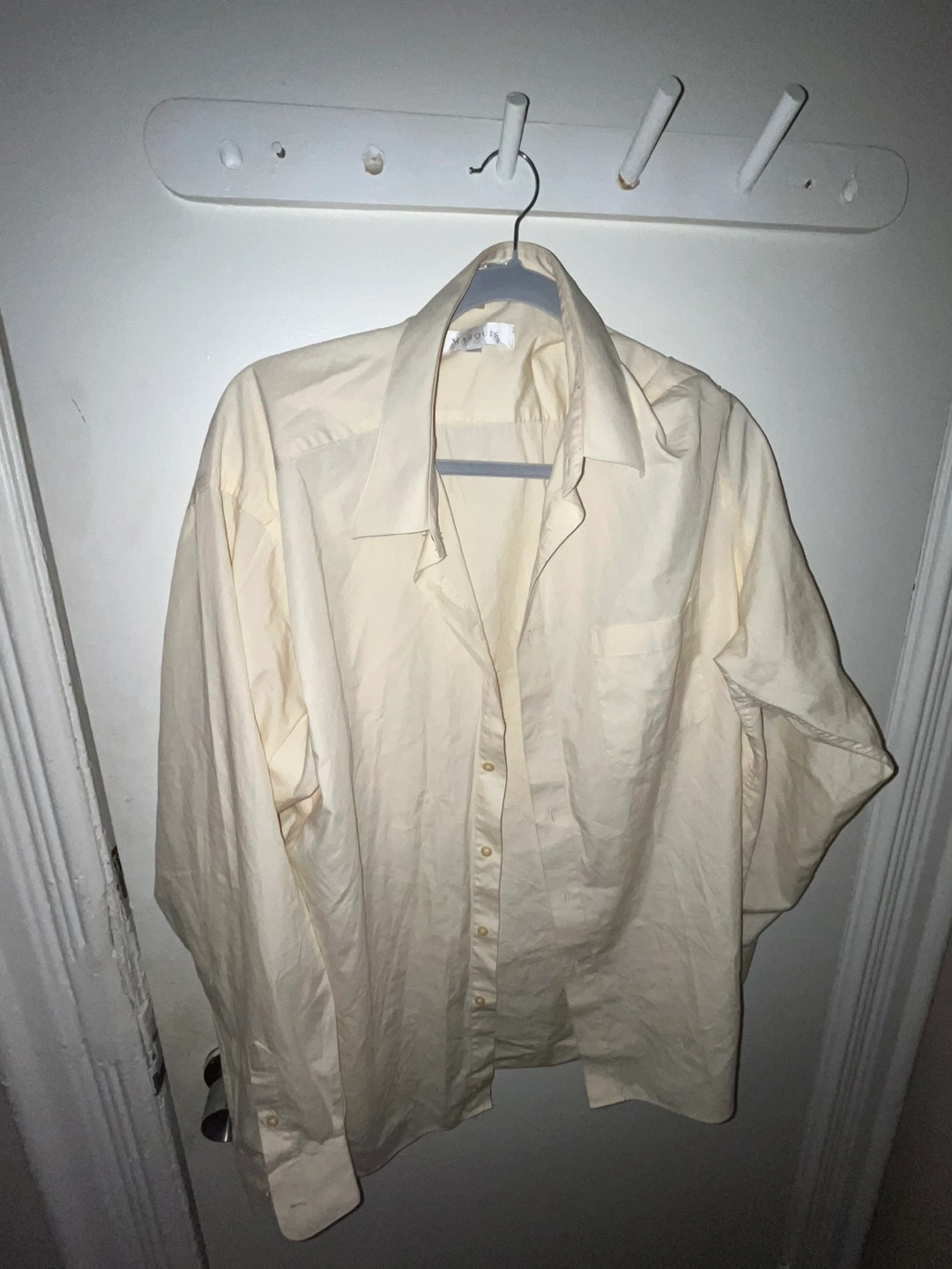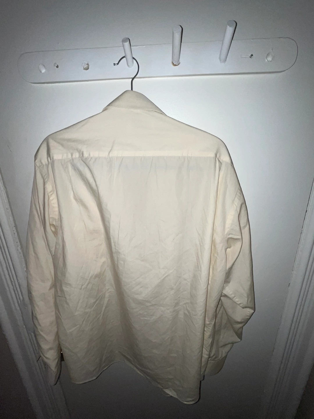 Long-sleeved button-up shirt. Pale yellow colour. Classic style. Good for work or special occasions.