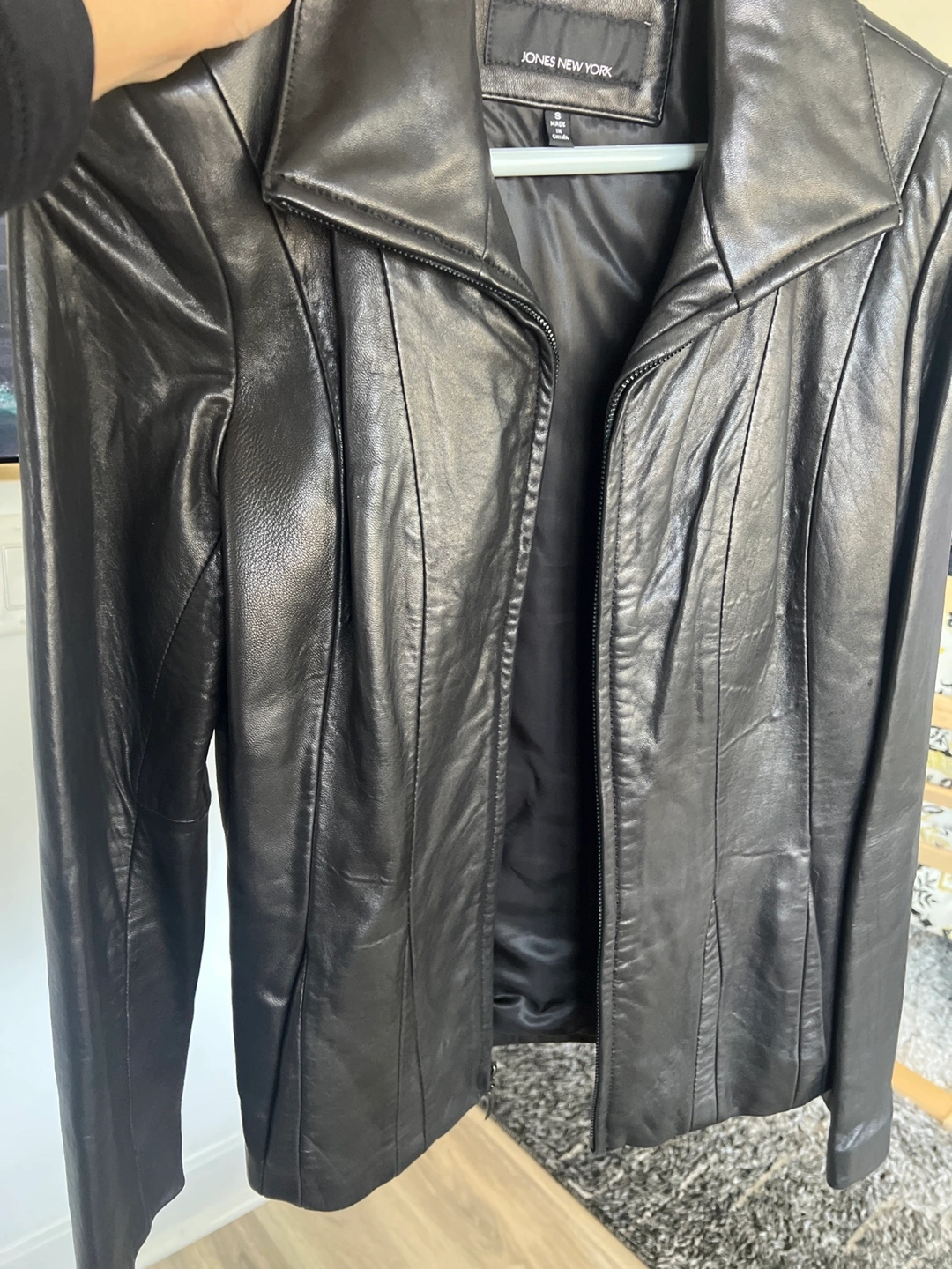 Women's black leather jacket. Size small. Zipper closure. Classic style. Made in Canada.