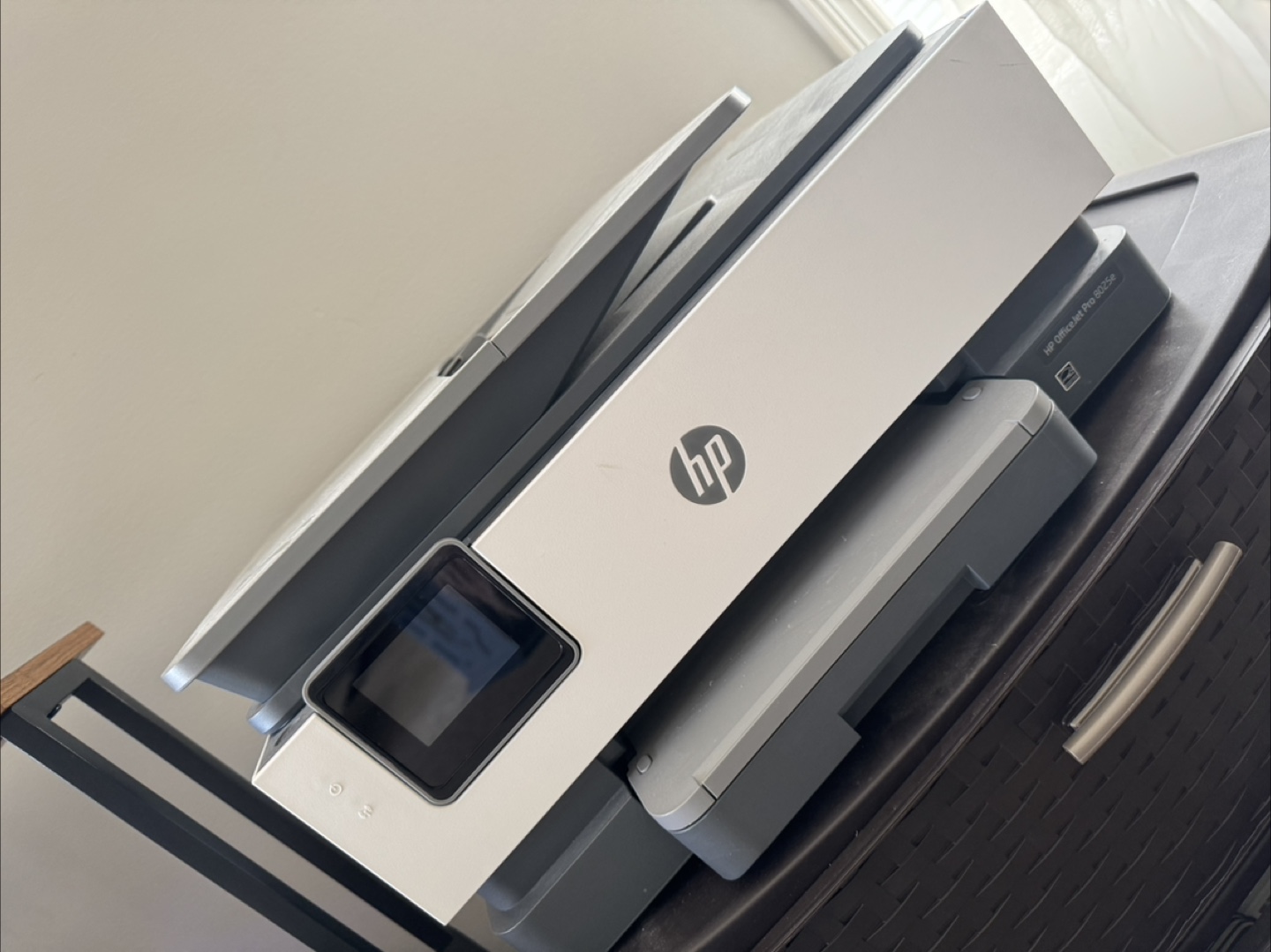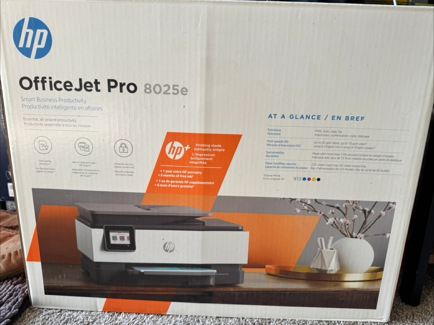 New HP OfficeJet Pro 8025e all-in-one printer. Prints, scans, copies, and faxes. Smart features. Excellent condition. Has ink