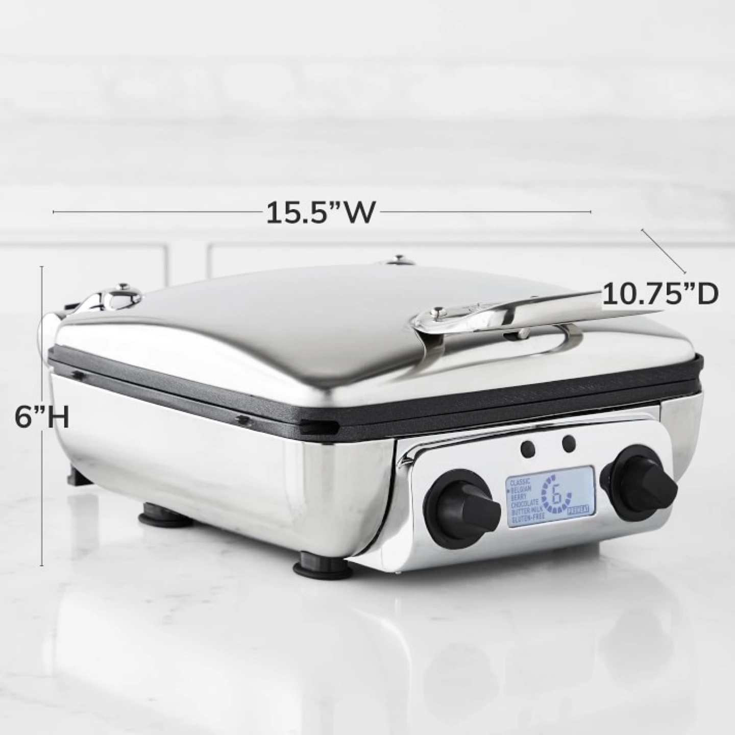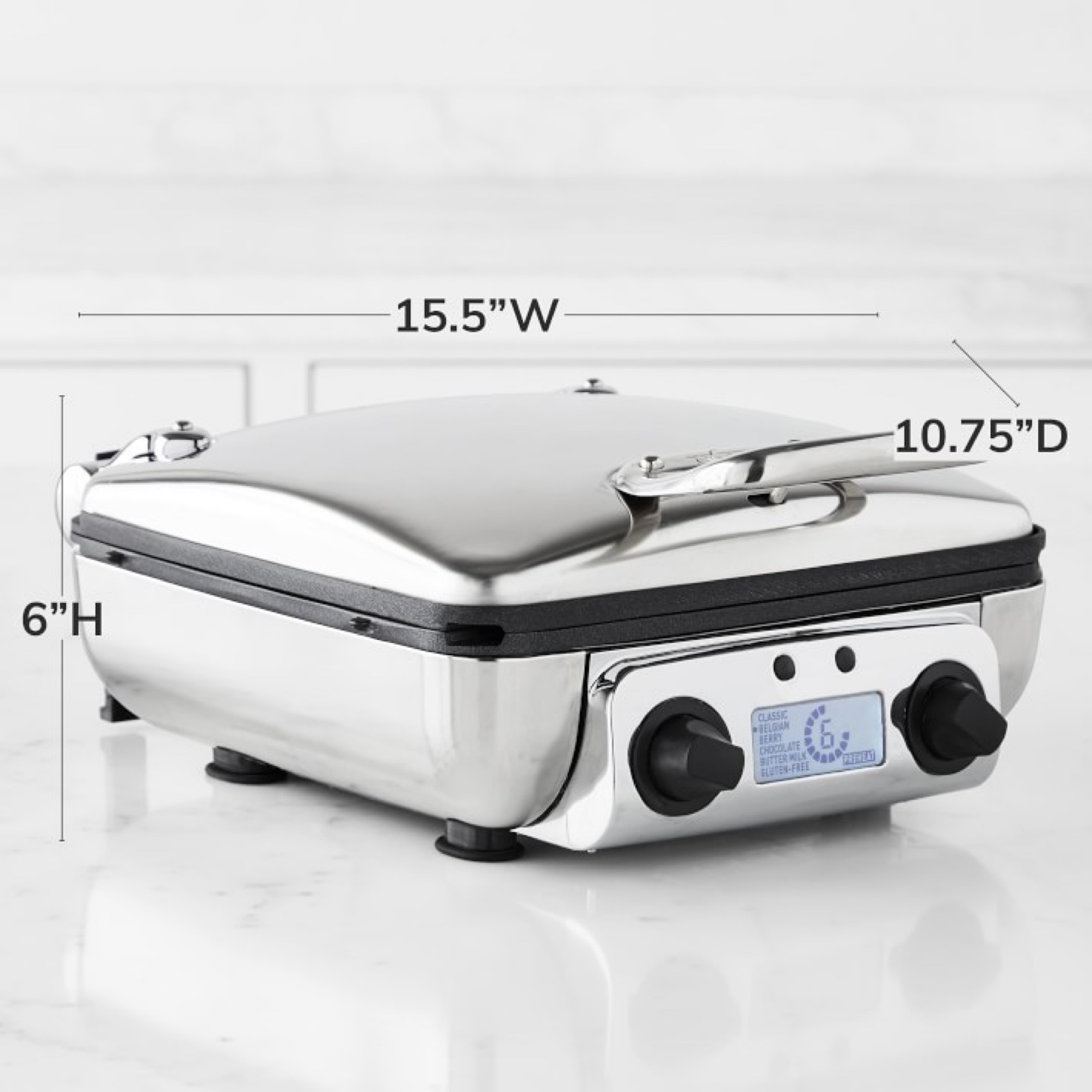 ✨Makes four 1"-thick, 4 1/2"-sq. waffles at once.