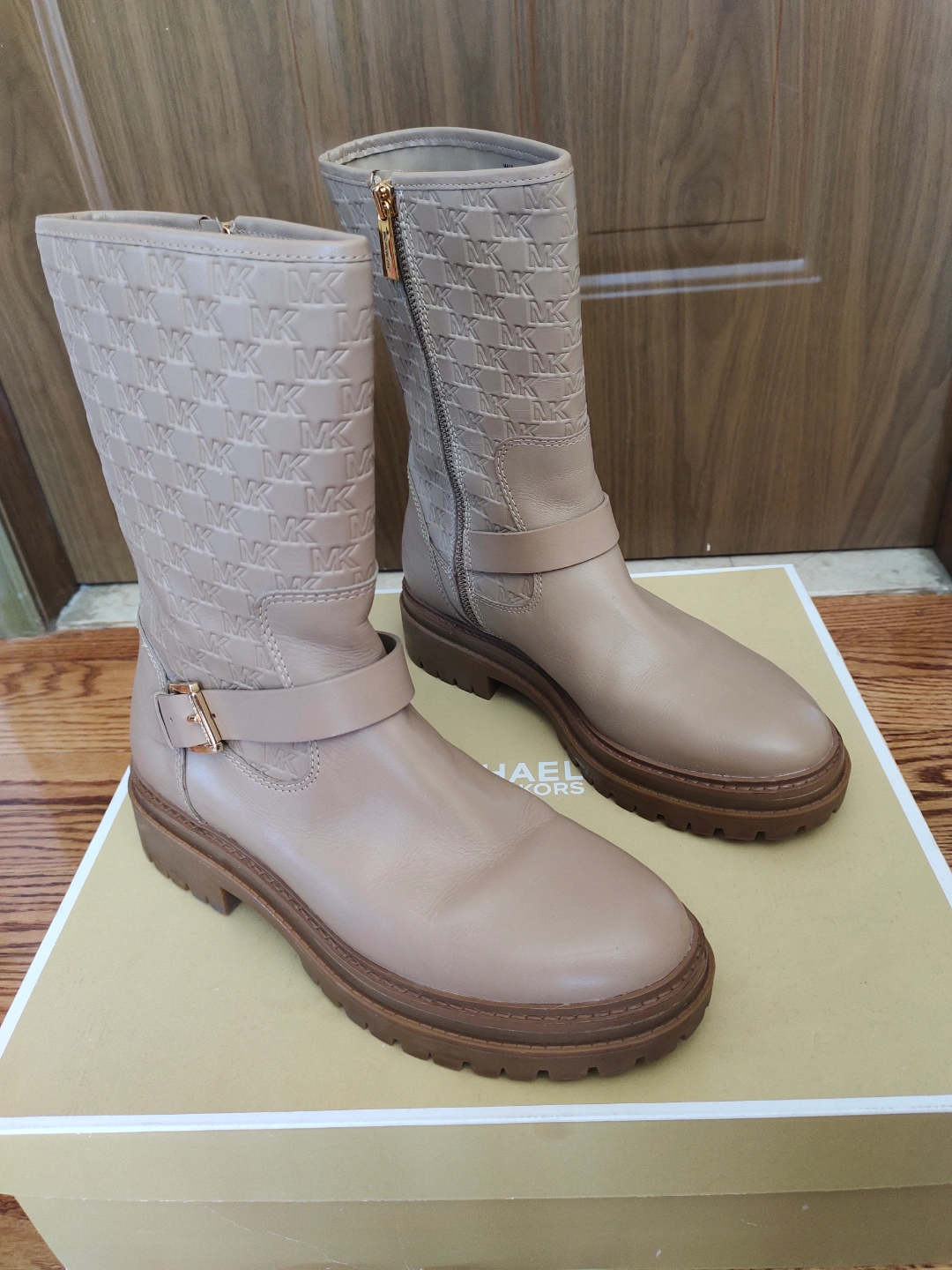 Beige leather boots. MK logo embossed. Side zipper and buckle detail. Chunky sole. Rarely used.