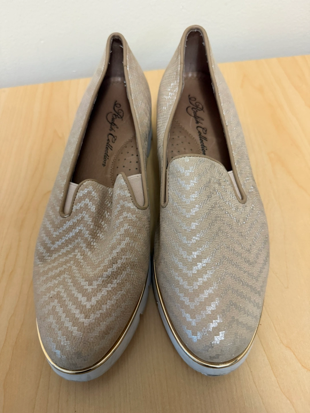 758Ralph collections Beige slip-on shoes with a silver zigzag pattern. Made in China. Features a cushioned insole and a low wedge heel. Size 37.5. Still good condition.