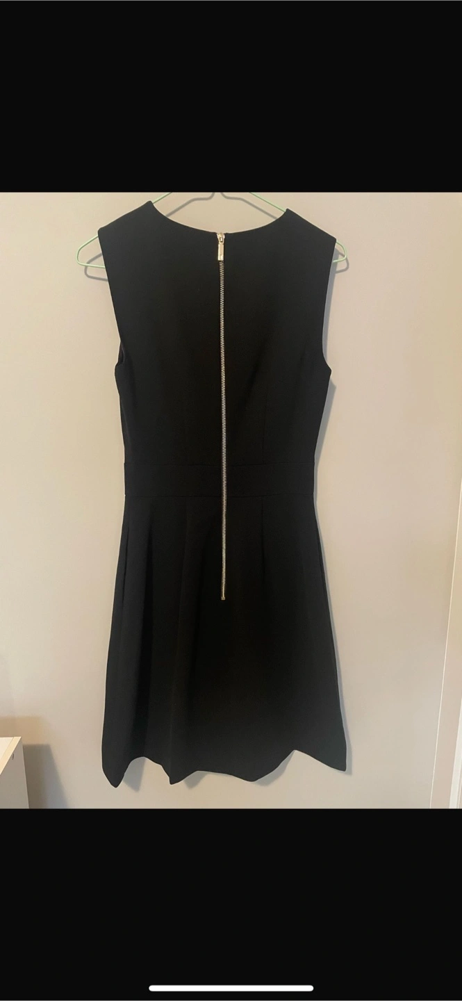 Elegant black dress. Sleeveless design. Features a ruched detail at the front and back. Hidden zipper closure. Great for special occasions or a night out.