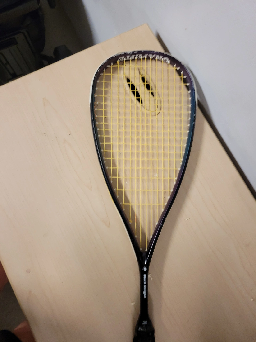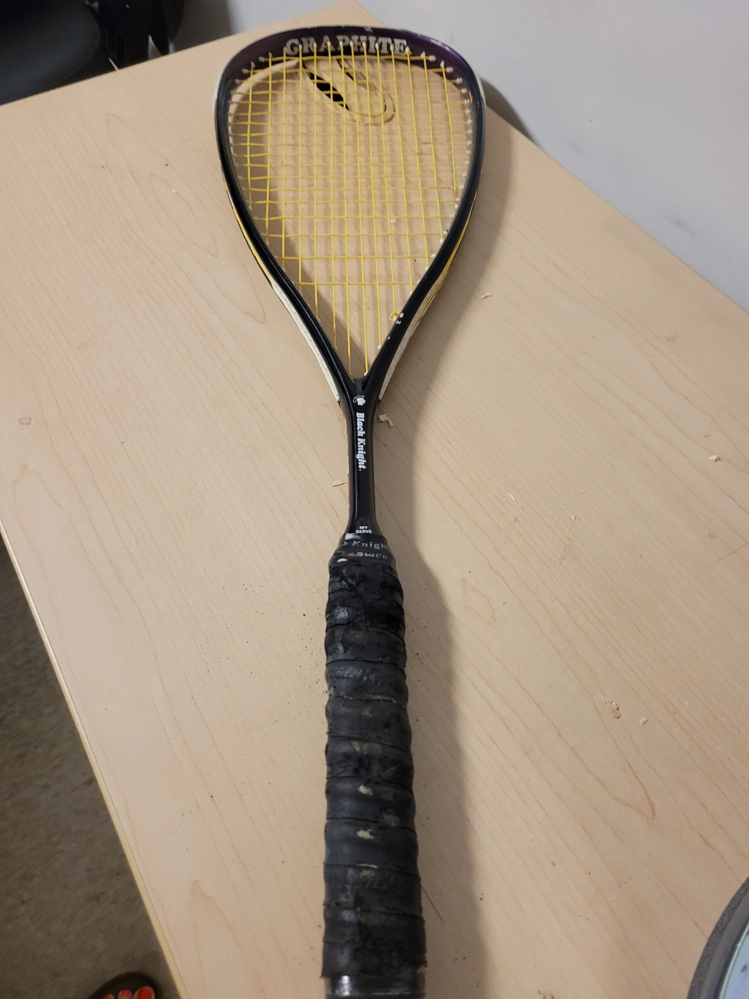 302Used Black Knight squash racquet. Graphite frame. Yellow strings. Some wear and tear on the grip.