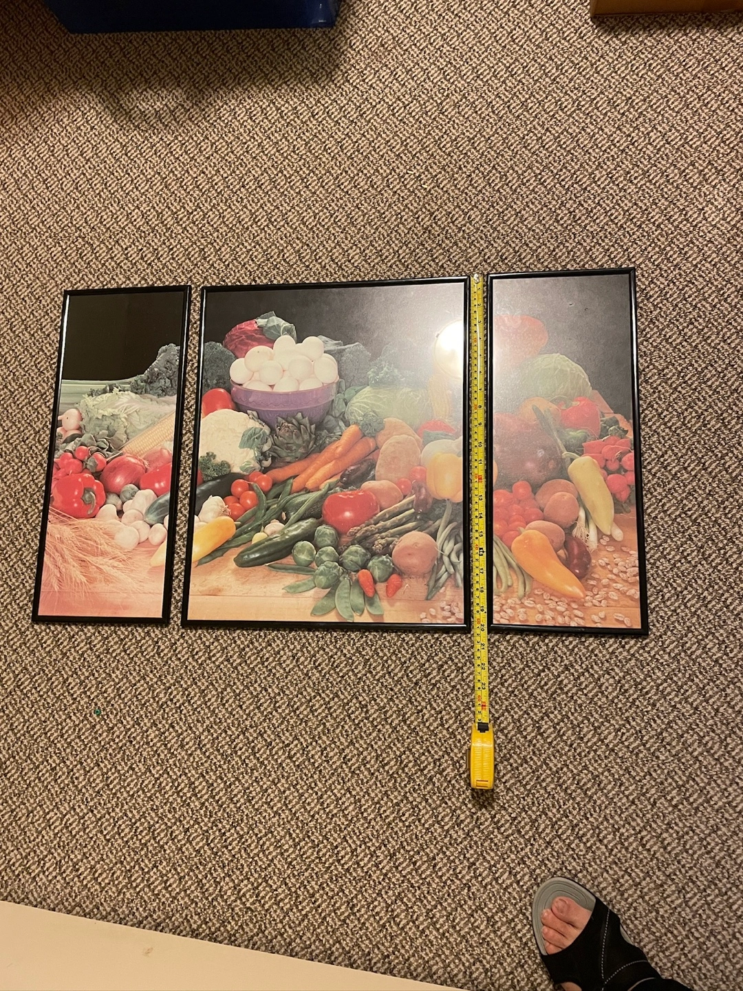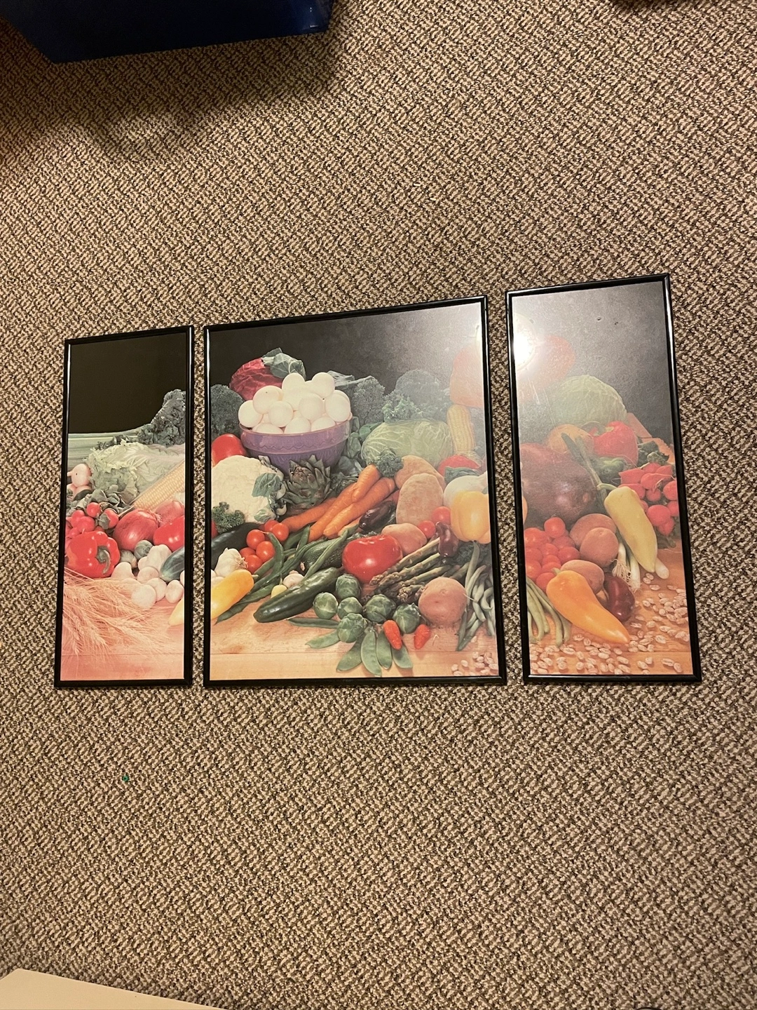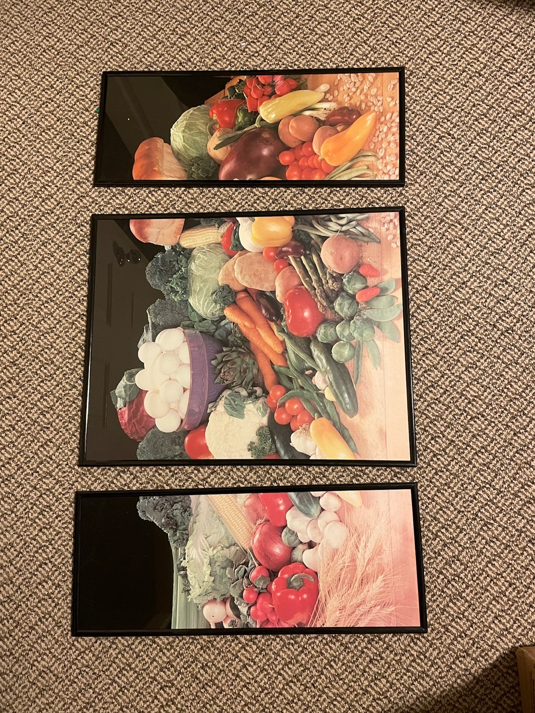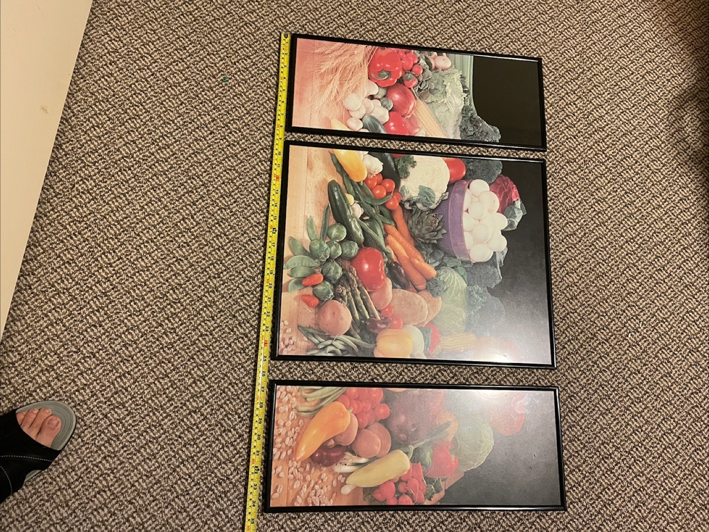 Set of three framed prints. Features vibrant still life images of various vegetables. Black frames. Good condition.