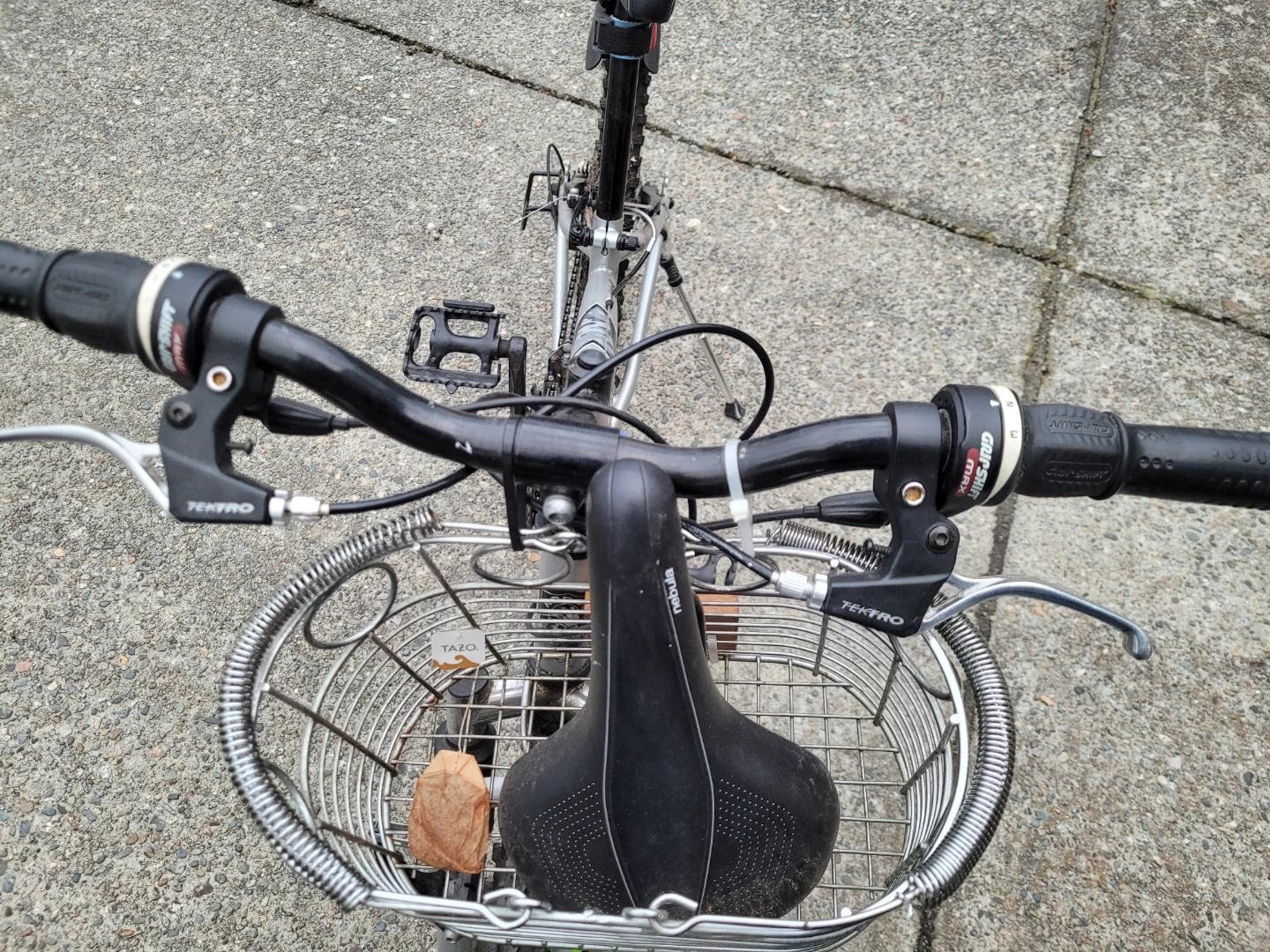 Silver ProForm mountain bike. Features front suspension, 21 speed Shimano gears, Tektro brakes and an attached front basket. Shows some wear and tear.