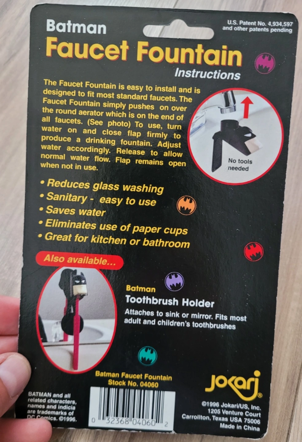 New in box Batman faucet fountain. Easily attaches to most standard faucets. Makes brushing fun! Safe and easy to use. Reduces glass washing. Saves water. Eliminates paper cups.