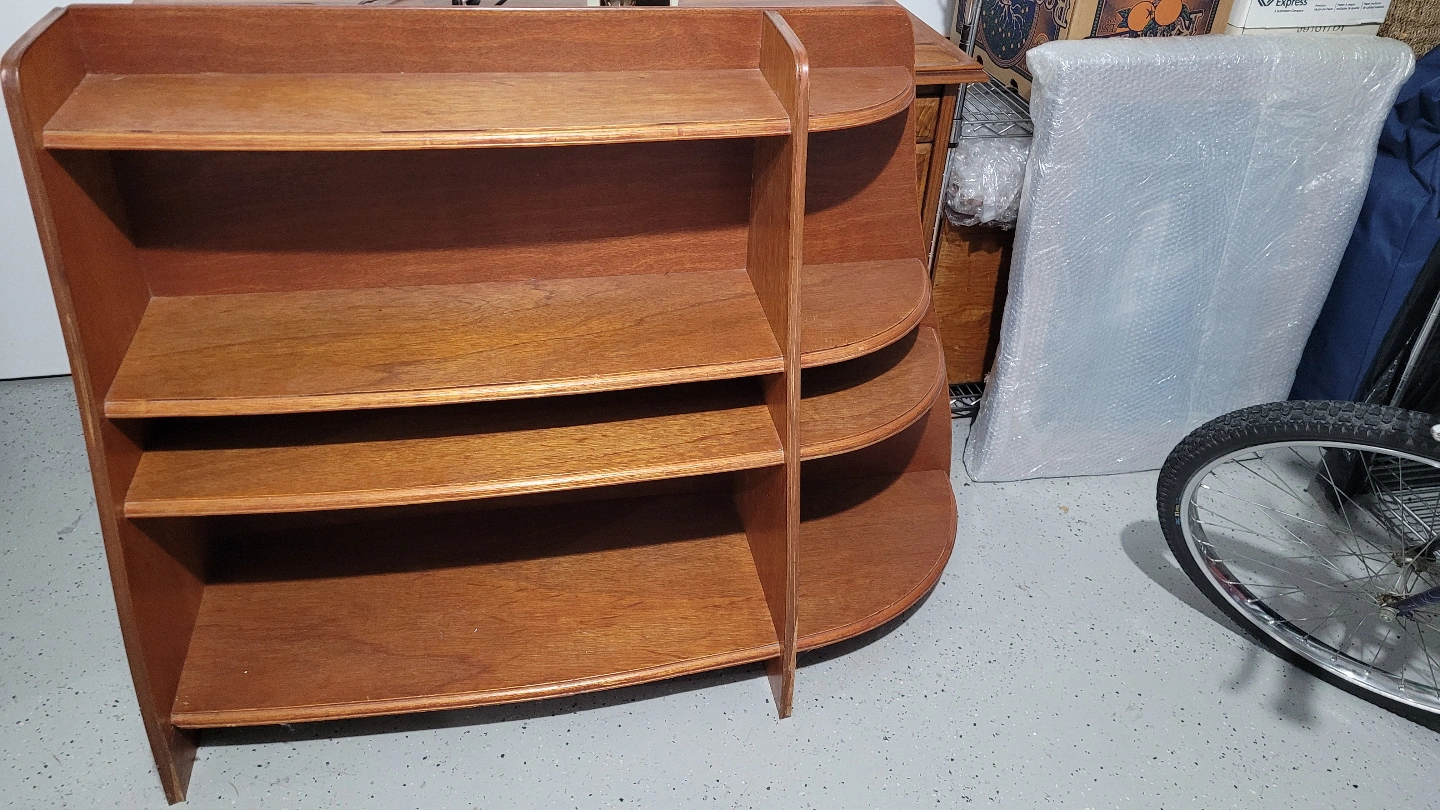 Free-standing wooden shelving unit. Four shelves. Curved design. Solid wood construction. Good condition.