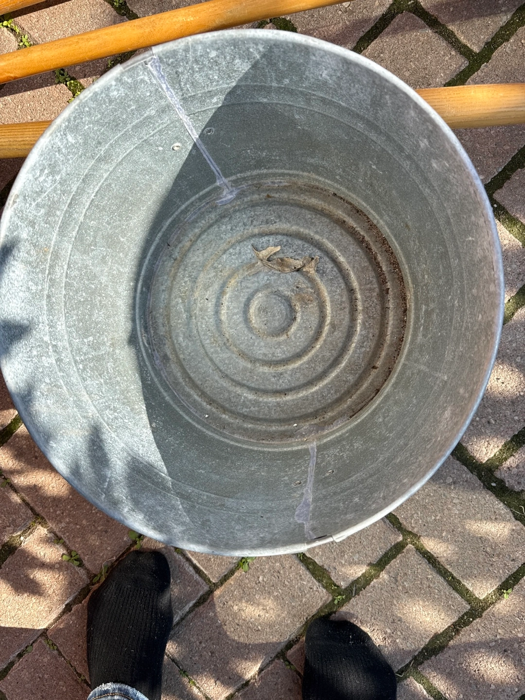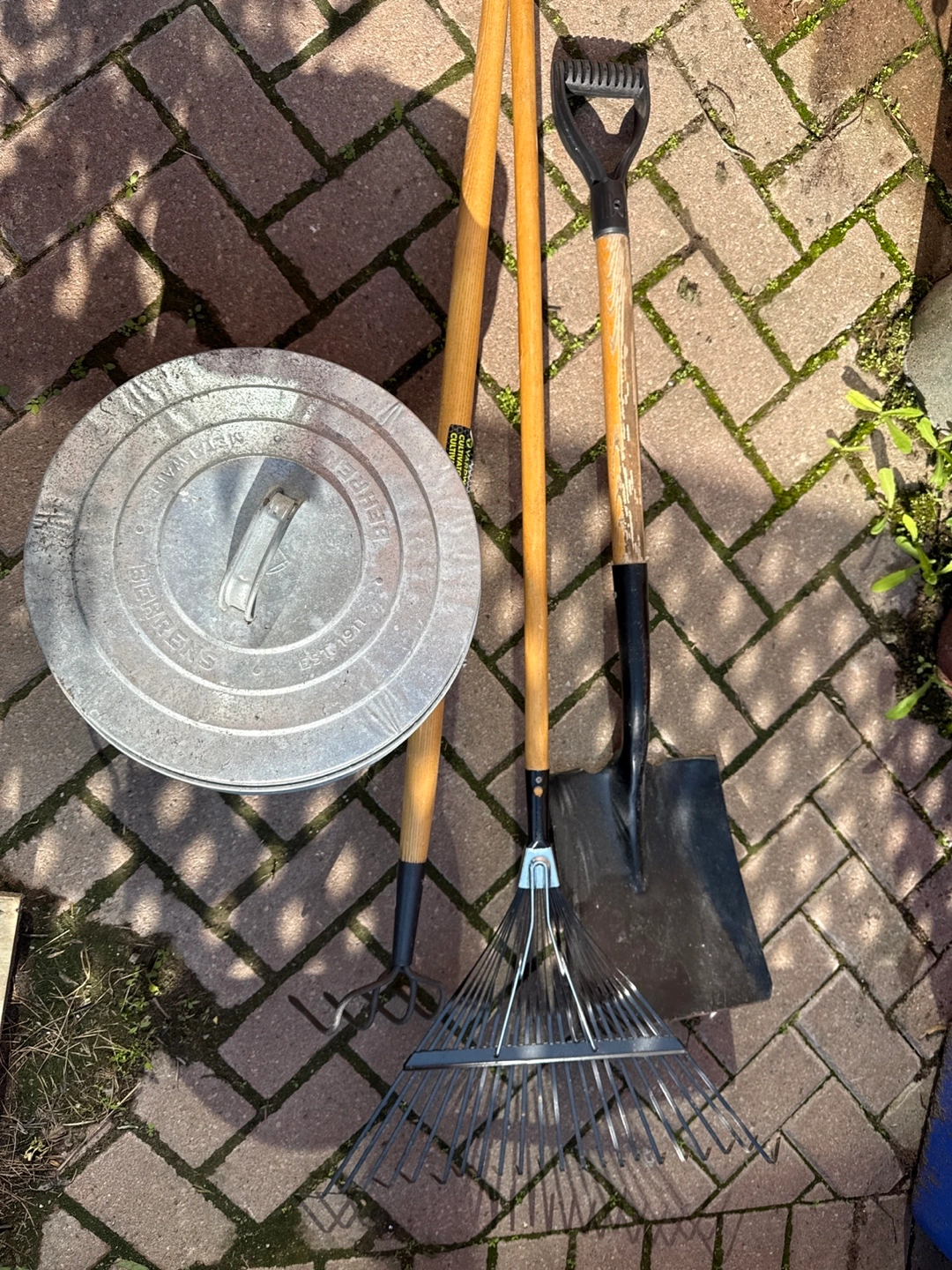 Set includes a galvanized metal container, a garden shovel, and a leaf rake. Wooden handles. Great for yard work and gardening.