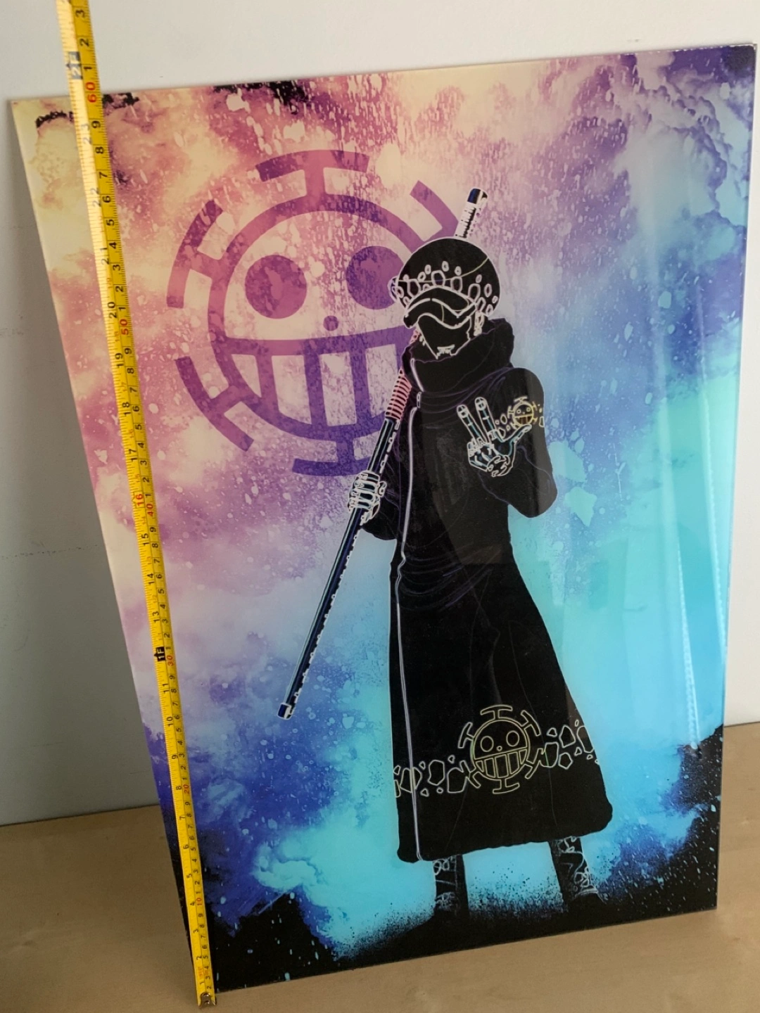 121Large acrylic print featuring Trafalgar Law from One Piece. Beautiful watercolour-style background. Great for any fan!