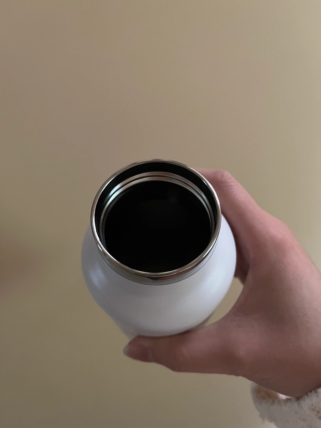 White insulated water bottle. Stainless steel accents. Carry loop on lid. Keeps drinks cold or hot. Brand new.