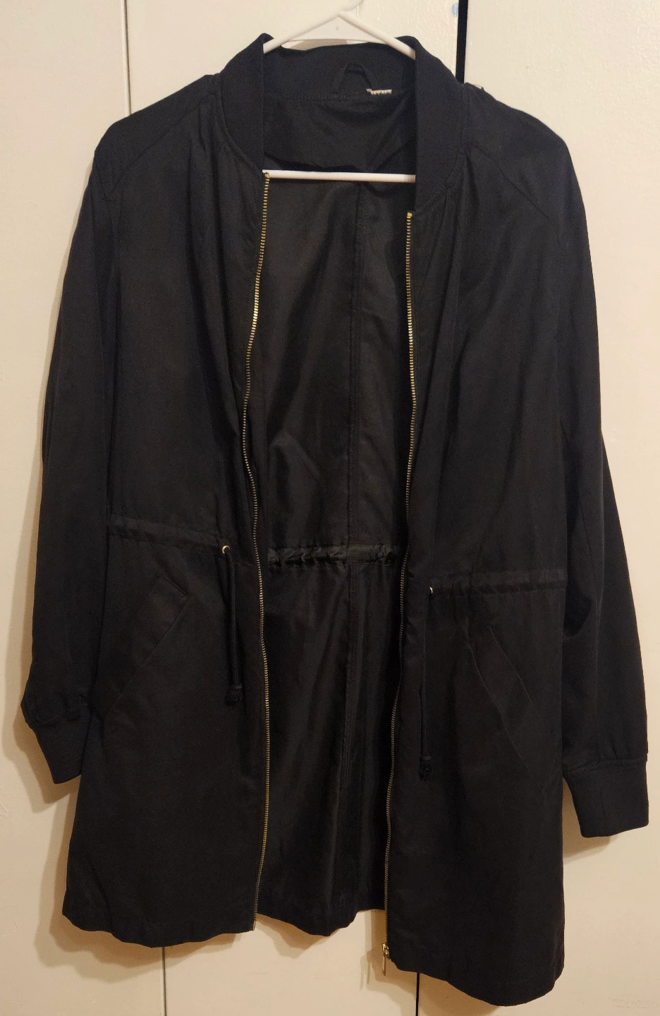 Lightweight black jacket. Features a full zip closure and drawstring waist. Long sleeves. Great for layering.