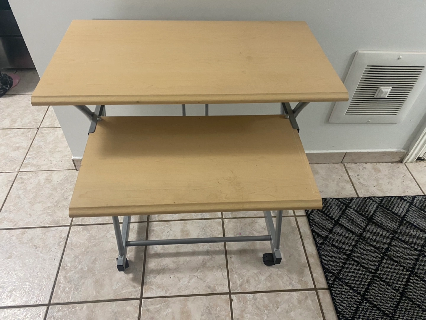 Two-tiered computer desk. Light beige wood finish. Silver metal frame. Wheels for mobility. Small size, ideal for small spaces.