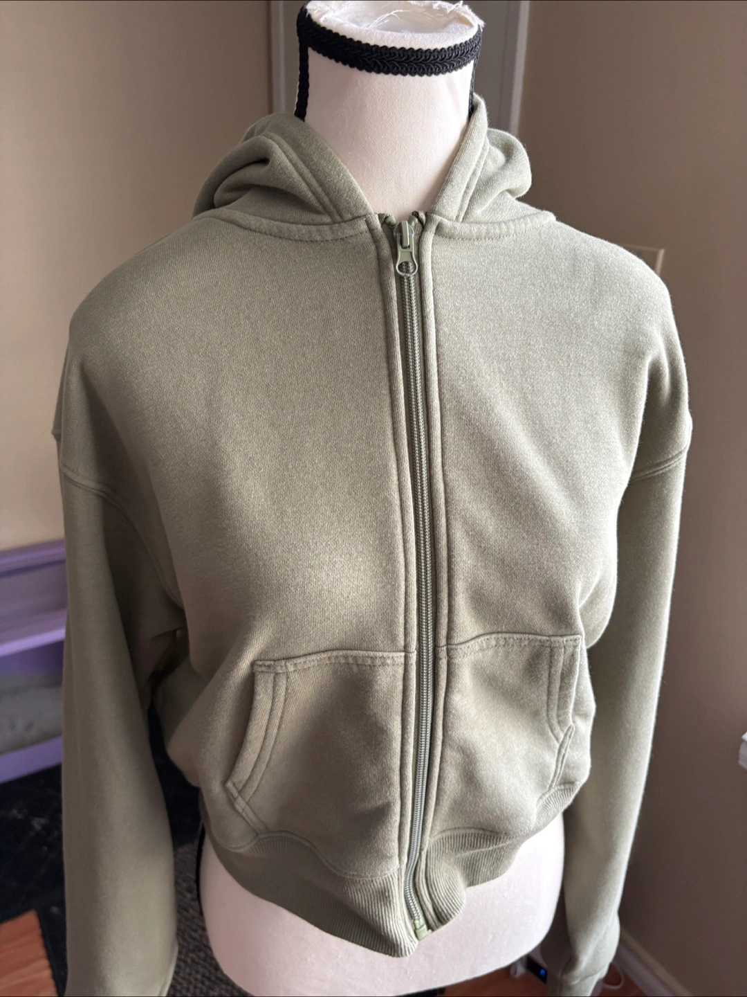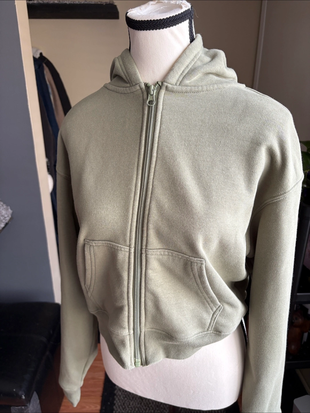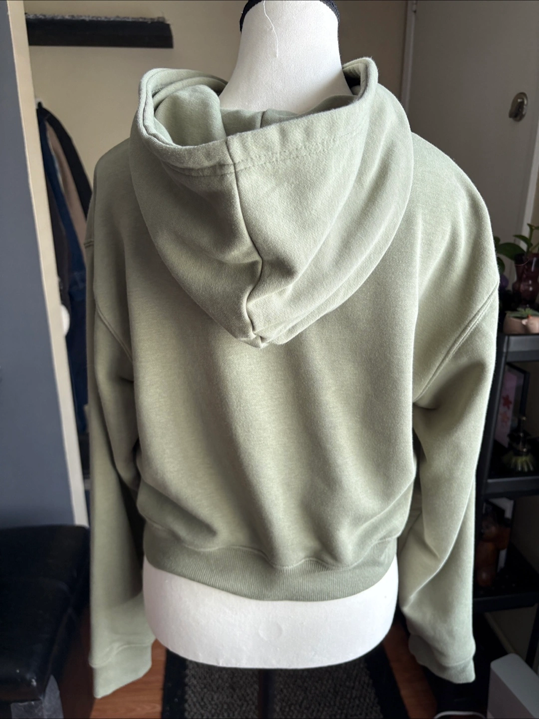 Sage green cropped zip-up hoodie. Long sleeves, kangaroo pocket. Soft material, perfect for layering. Size M