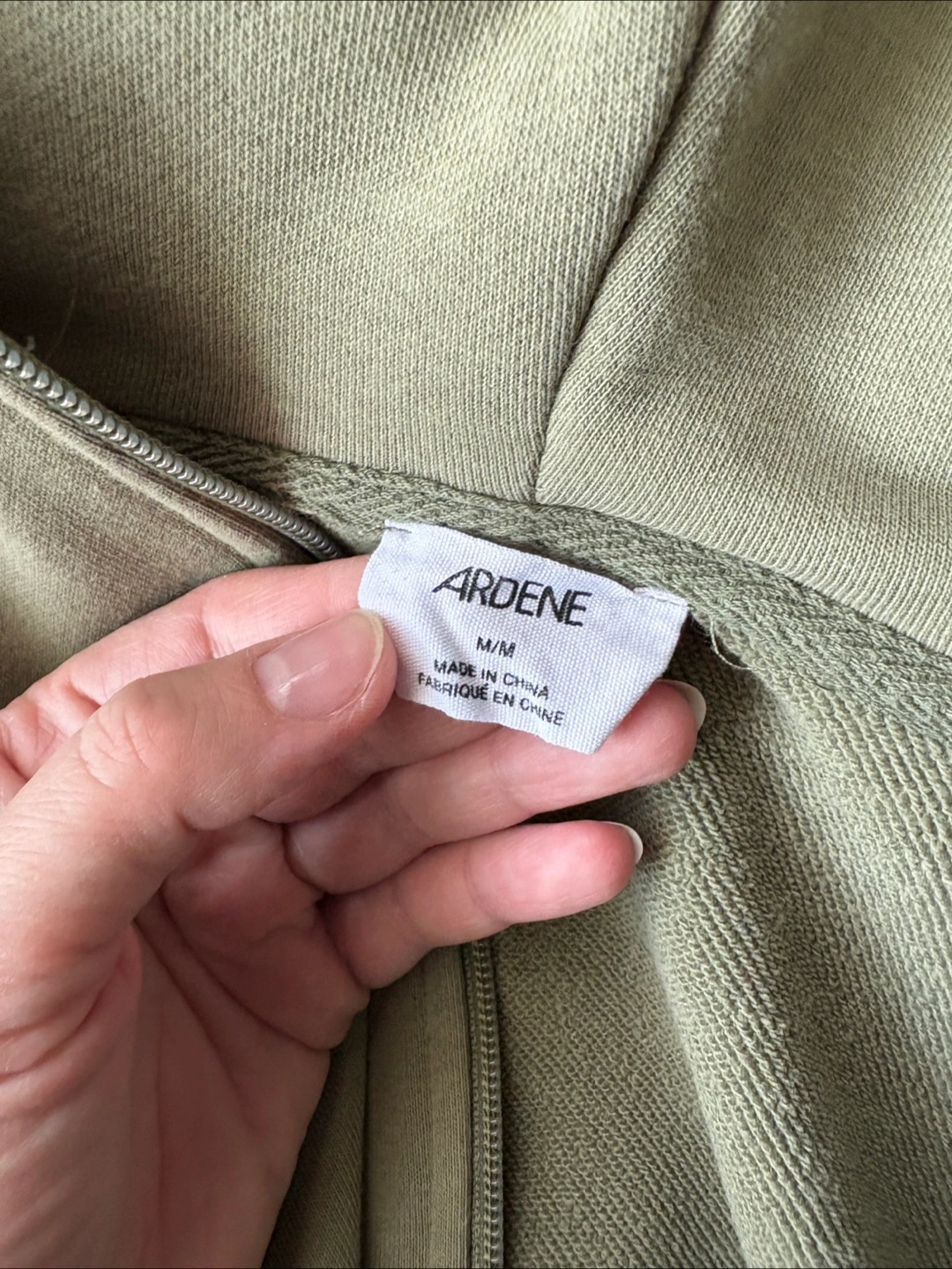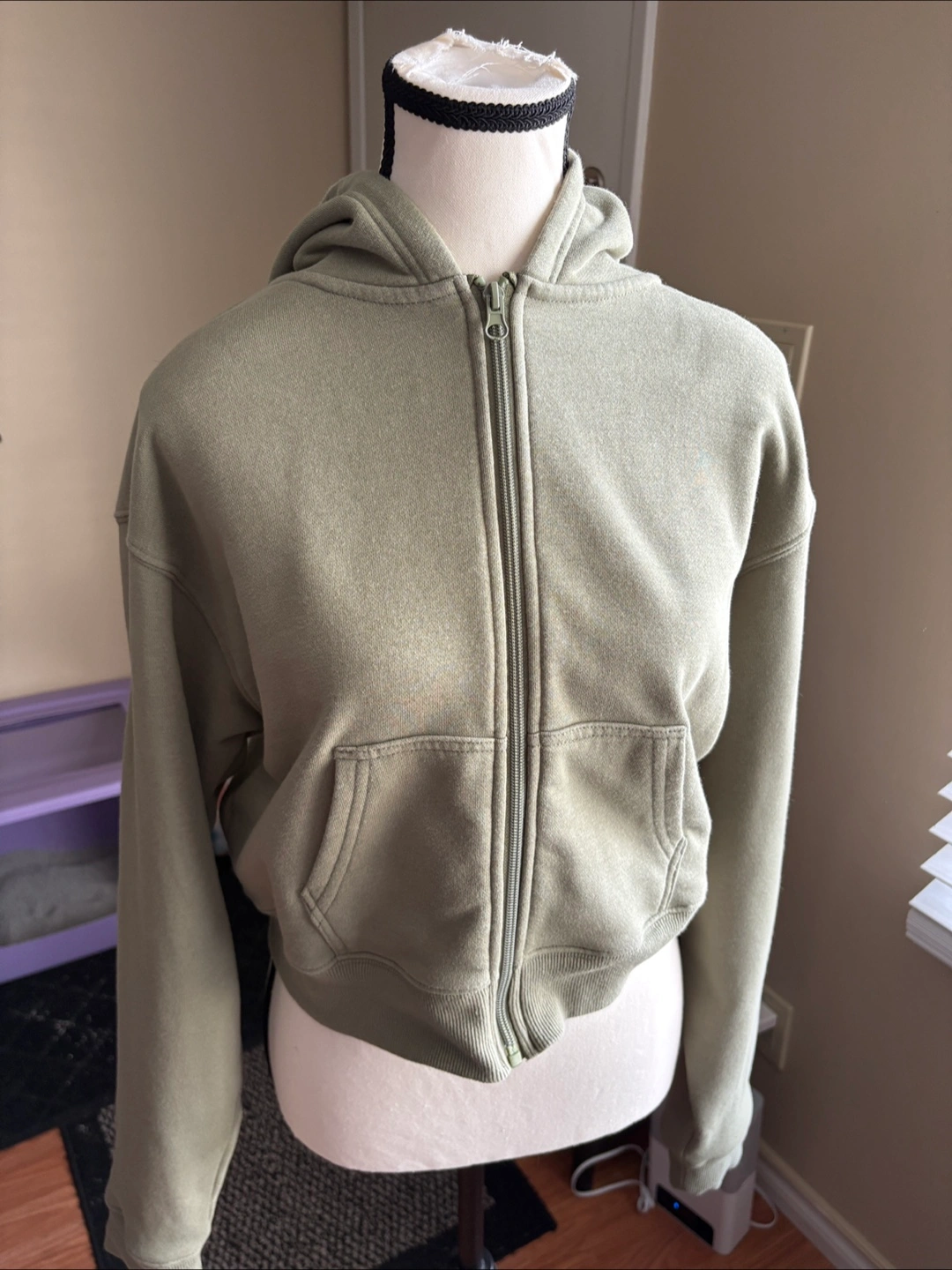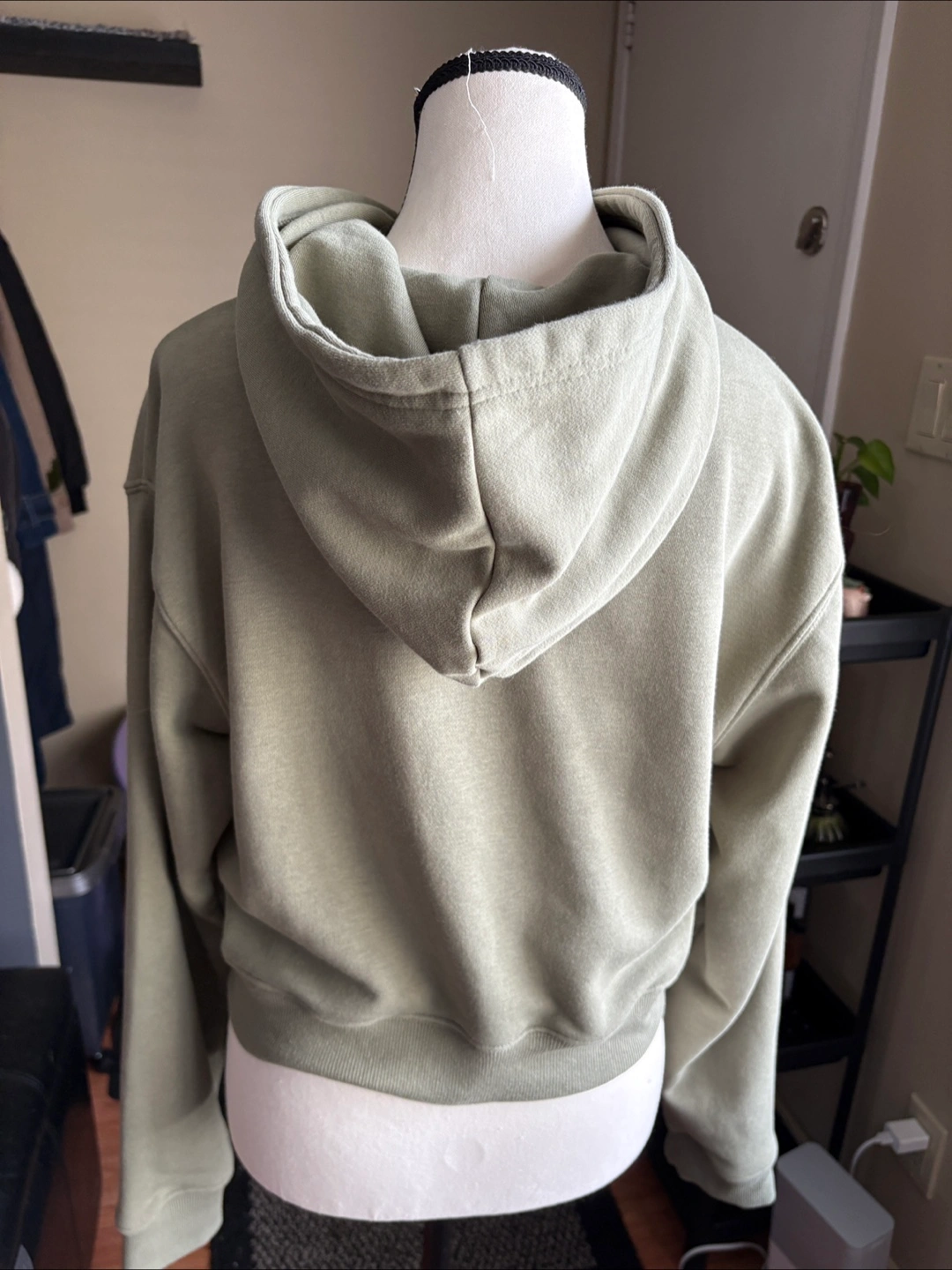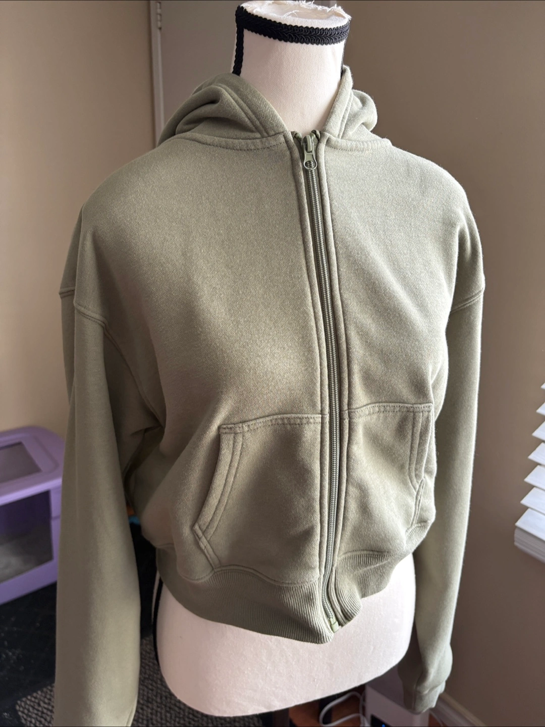 Sage green cropped zip-up hoodie. Long sleeves, kangaroo pocket. Soft material, perfect for layering. Size M