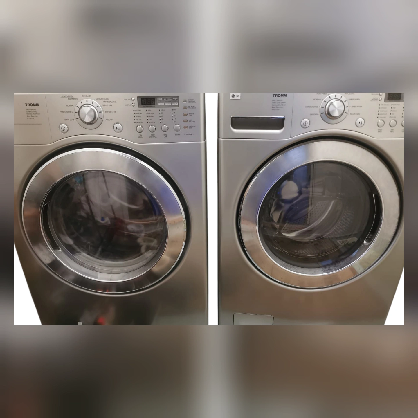 LG Tromm brand, stainless steel washer and dryer set. Front-load machines. Multiple wash and dry cycles.