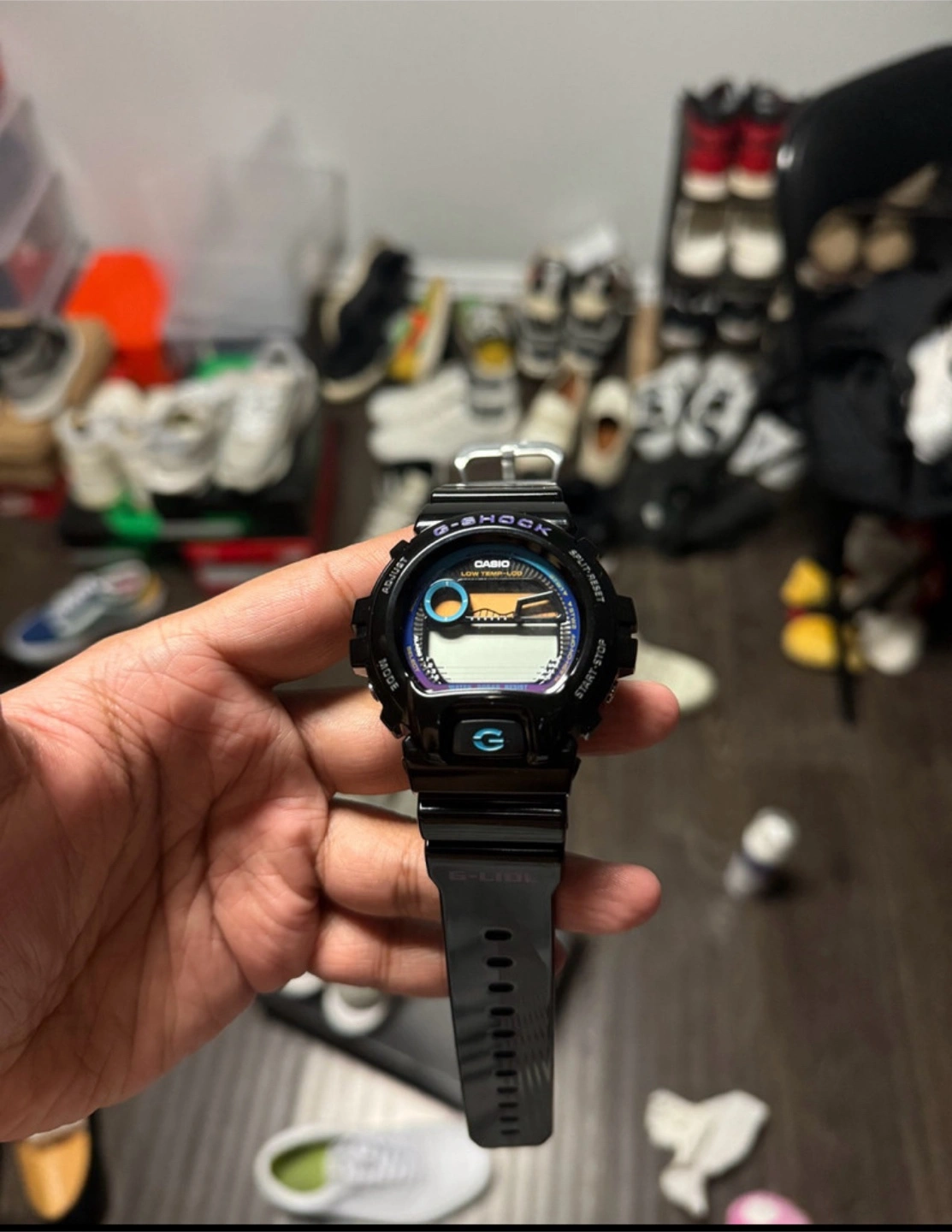 Black G-Shock watch. Digital display. G-Lide series. Features multiple buttons.