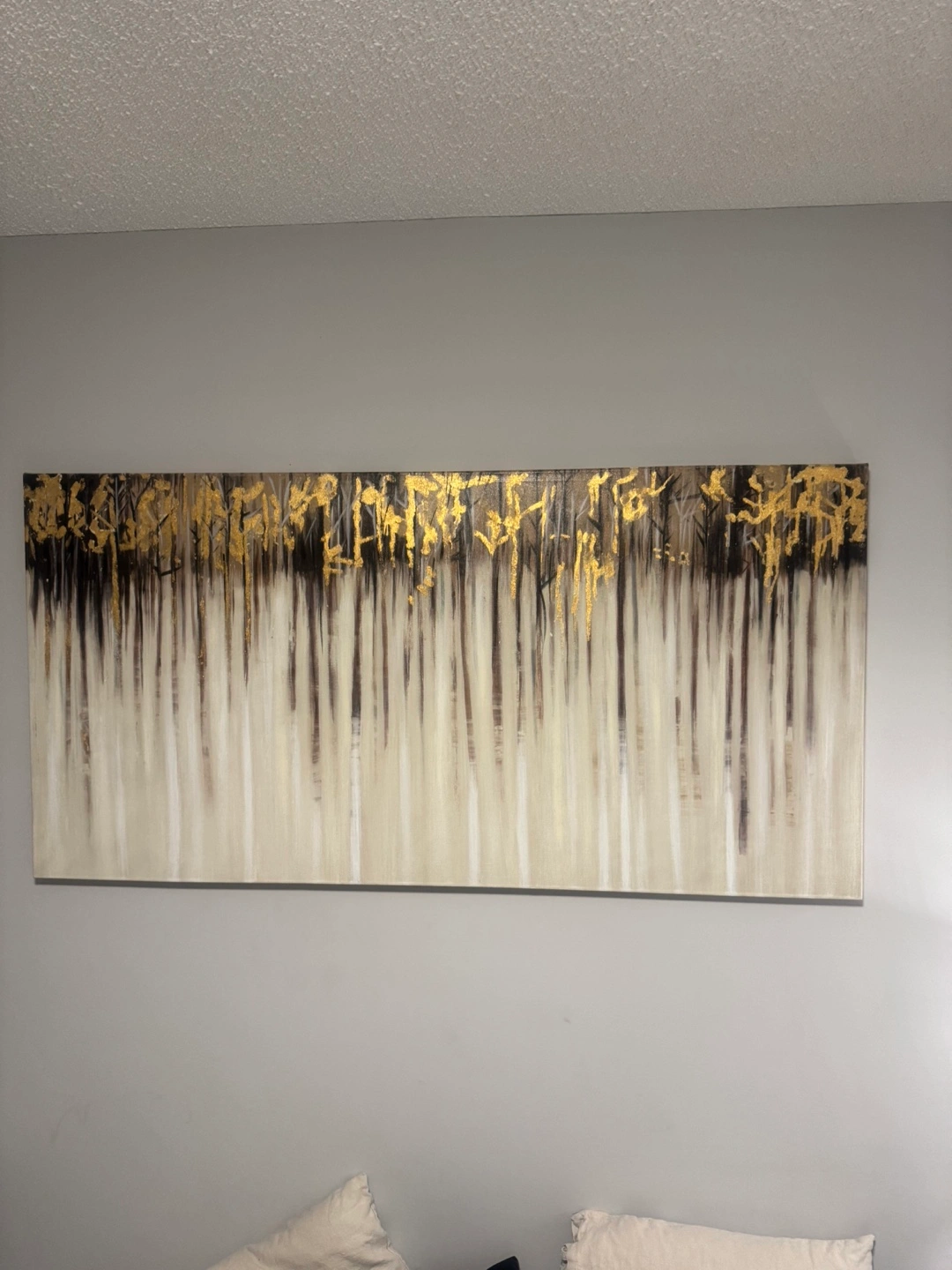 Beautiful large canvas wall art. Features an abstract design with gold leaf accents. Perfect for adding a touch of elegance to your home décor. Horizontal orientation.