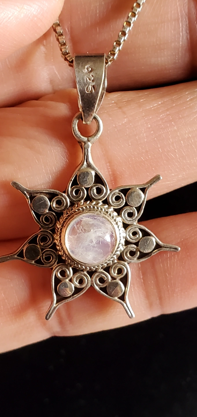 Beautiful sterling silver pendant necklace. Features a delicate flower design with a moonstone centrepiece. Comes with a silver chain. Unique and elegant.