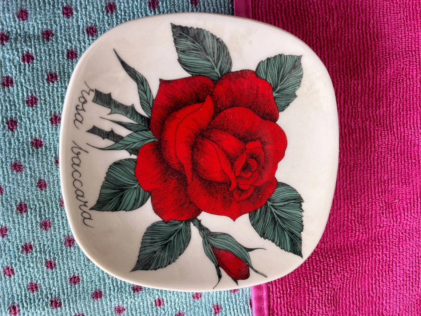 20Small decorative plate. Features a red rose. Excellent condition. Made in Finland.
