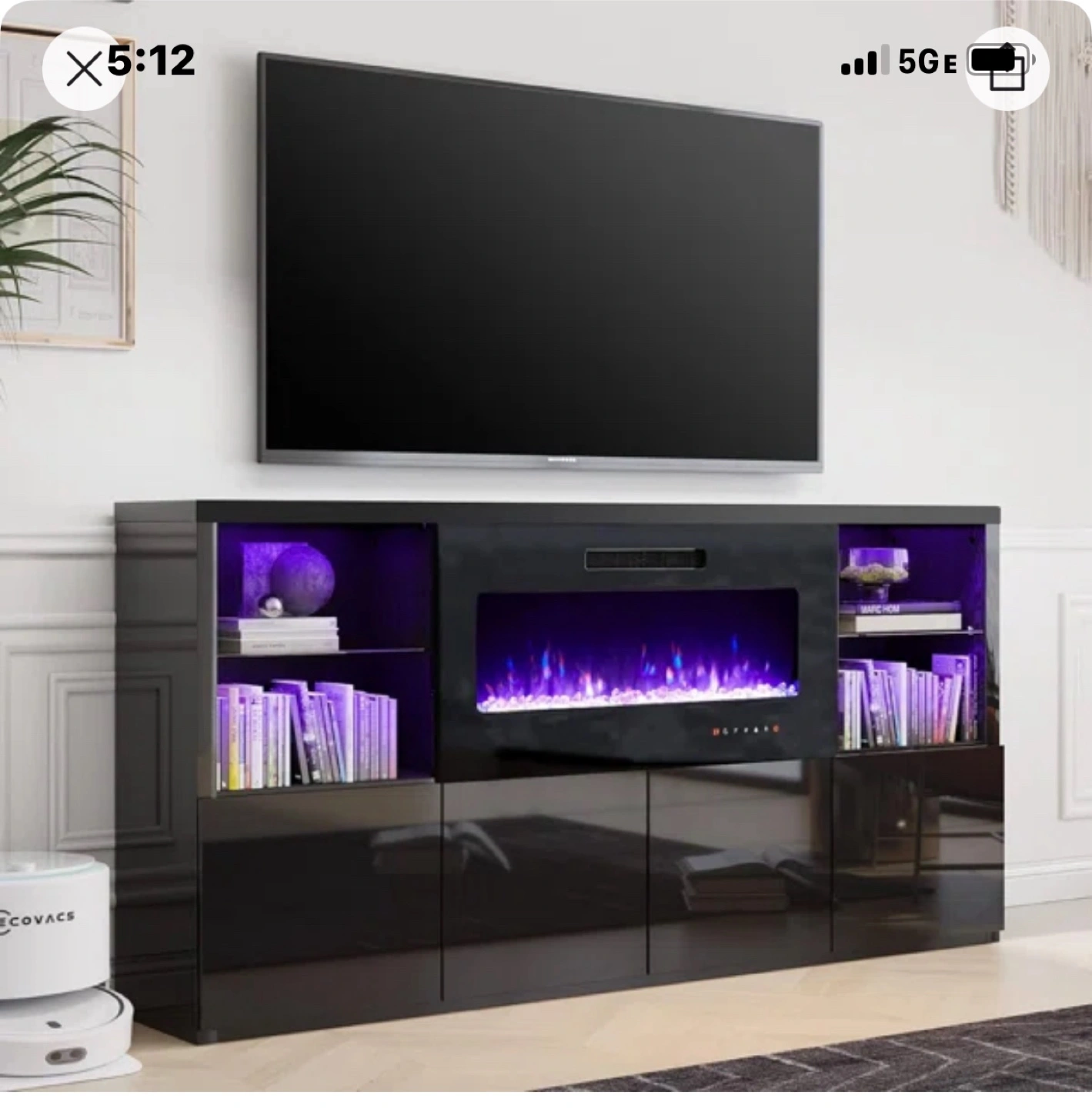 New in the box Sleek black high-gloss finish. Electric fireplace insert. Plenty of storage space. LED lighting. Perfect for living rooms.