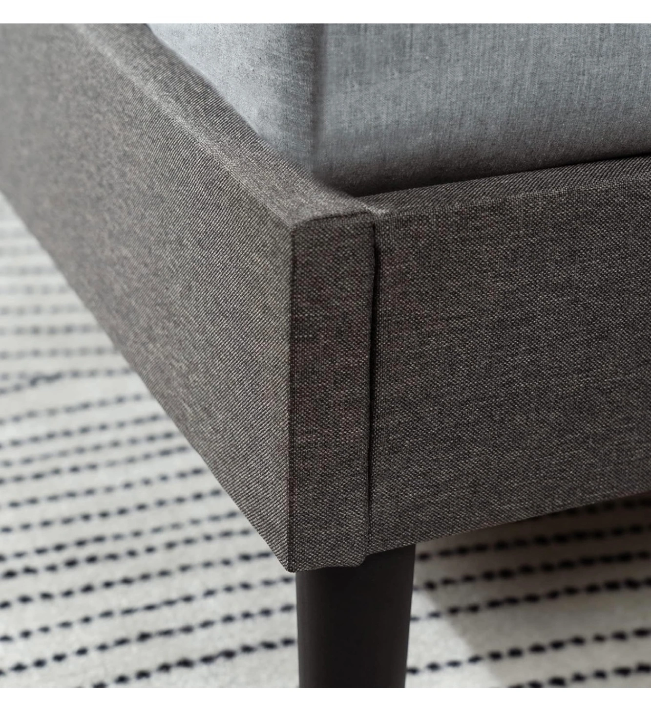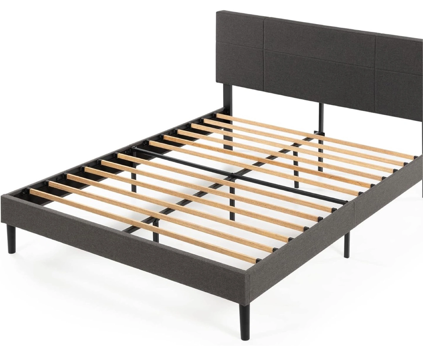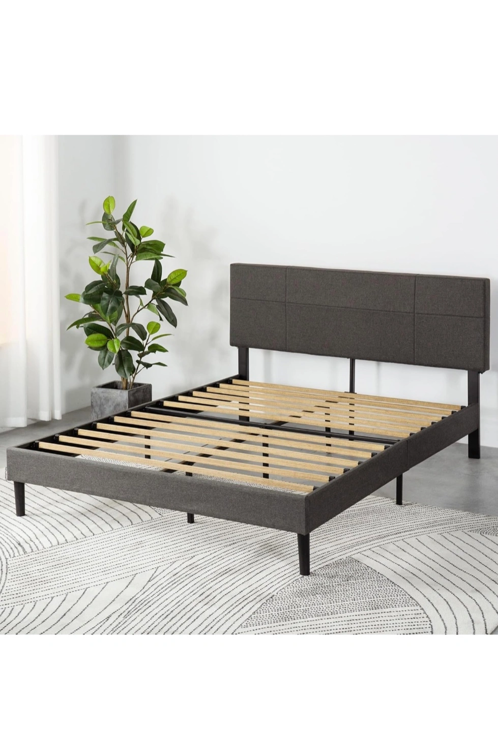-30Call or text on 6478228046 Queen size platform bed frame. Dark grey fabric headboard and frame. Wooden slats included. Sleek and modern design. Minimalist style. Sturdy construction.