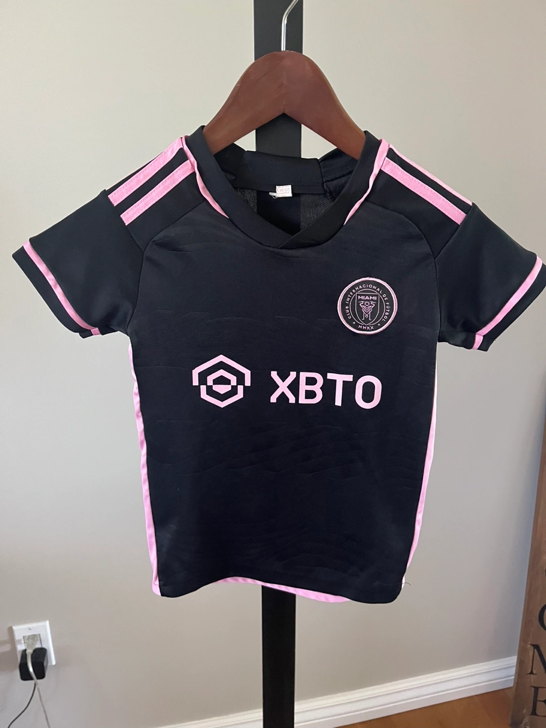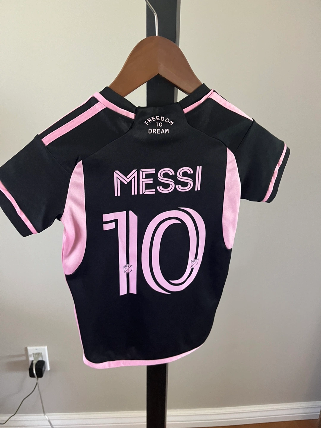 Kids' size Small Inter Miami CF soccer jersey. Black with pink accents. Features Messi's name and number 10. Freedom to Dream. Pick up in Liberty Village
