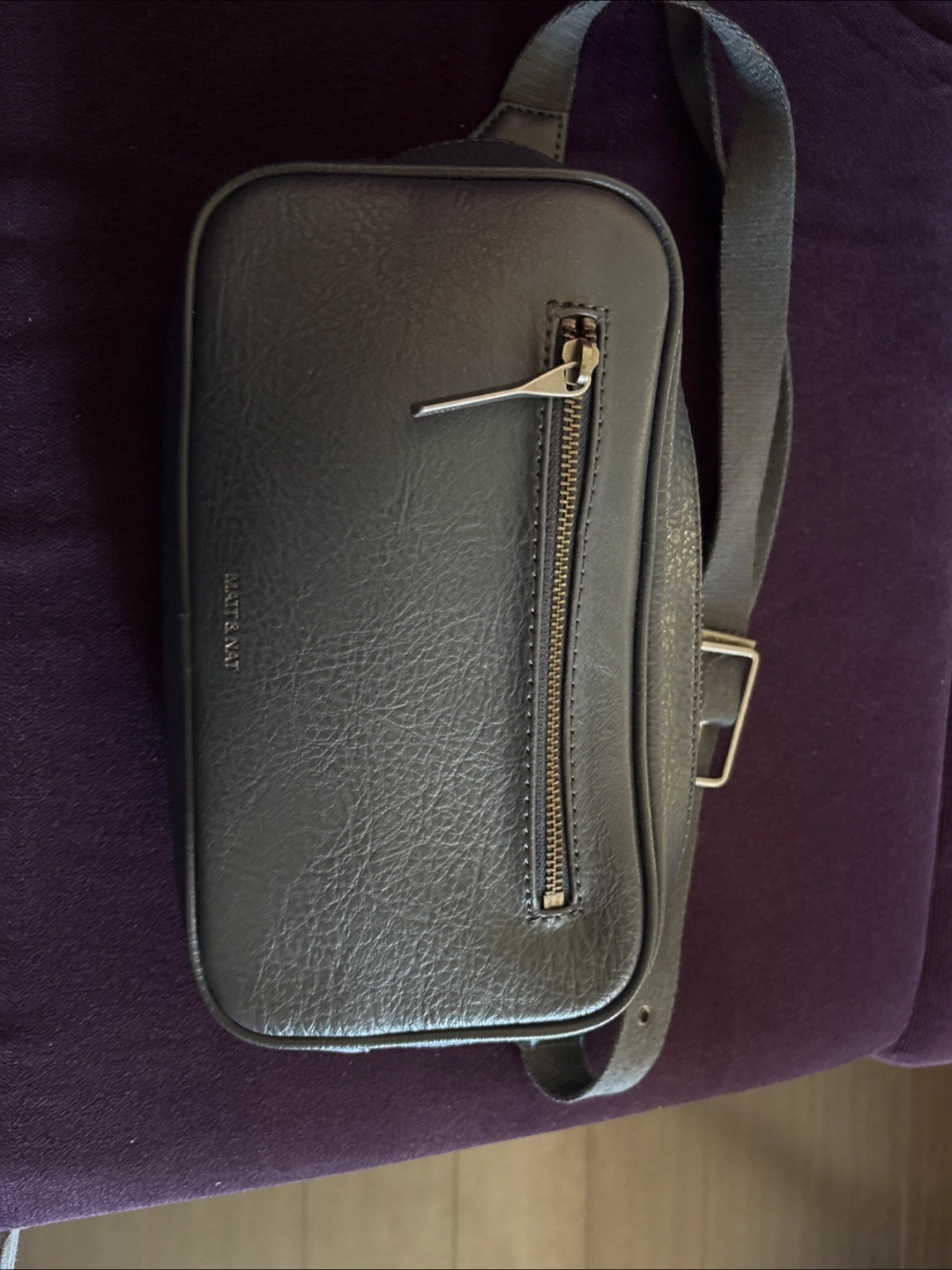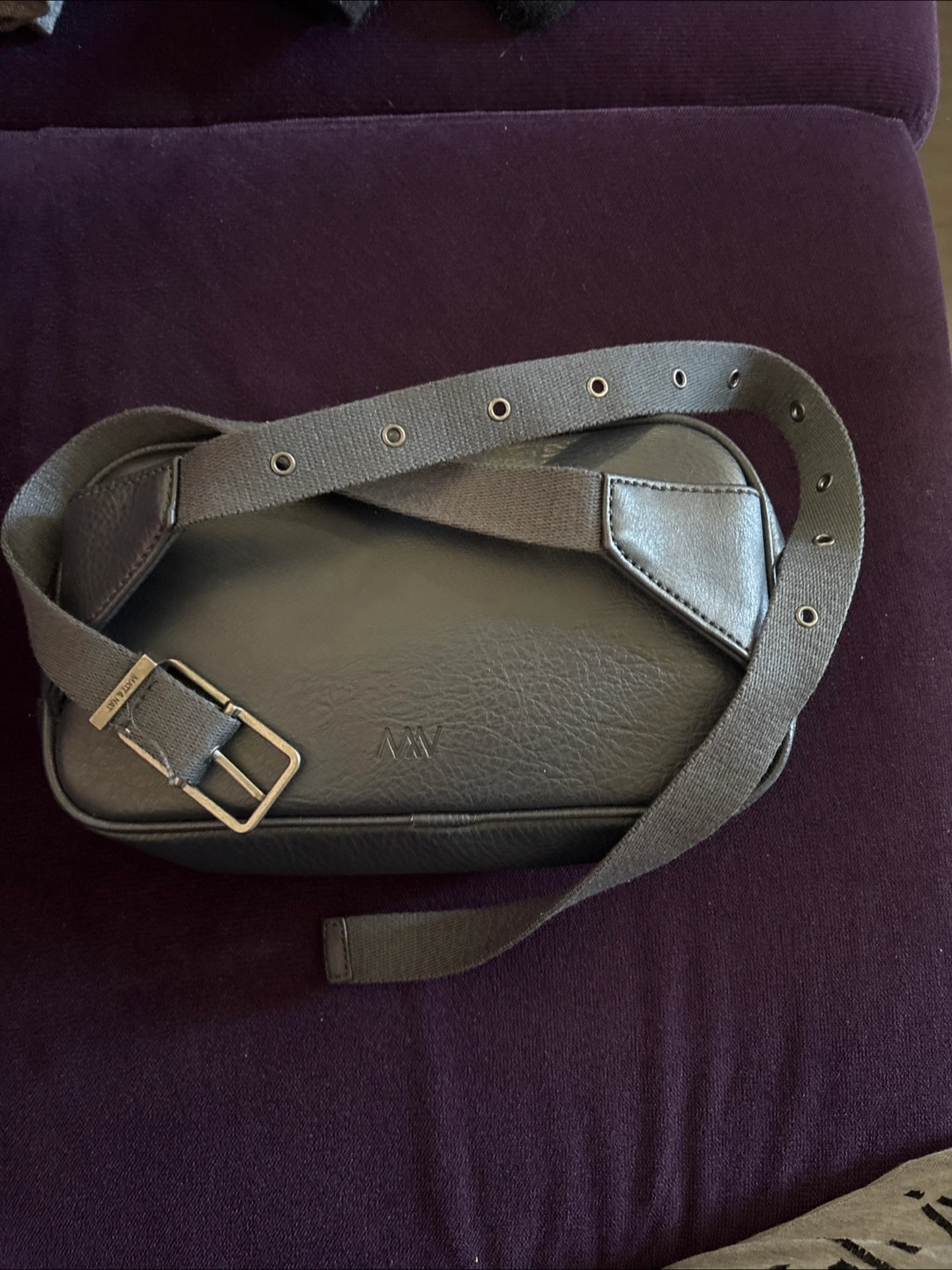 Dark grey vegan leather belt bag. Adjustable strap. Zipper closure. Small interior pocket. Excellent condition.