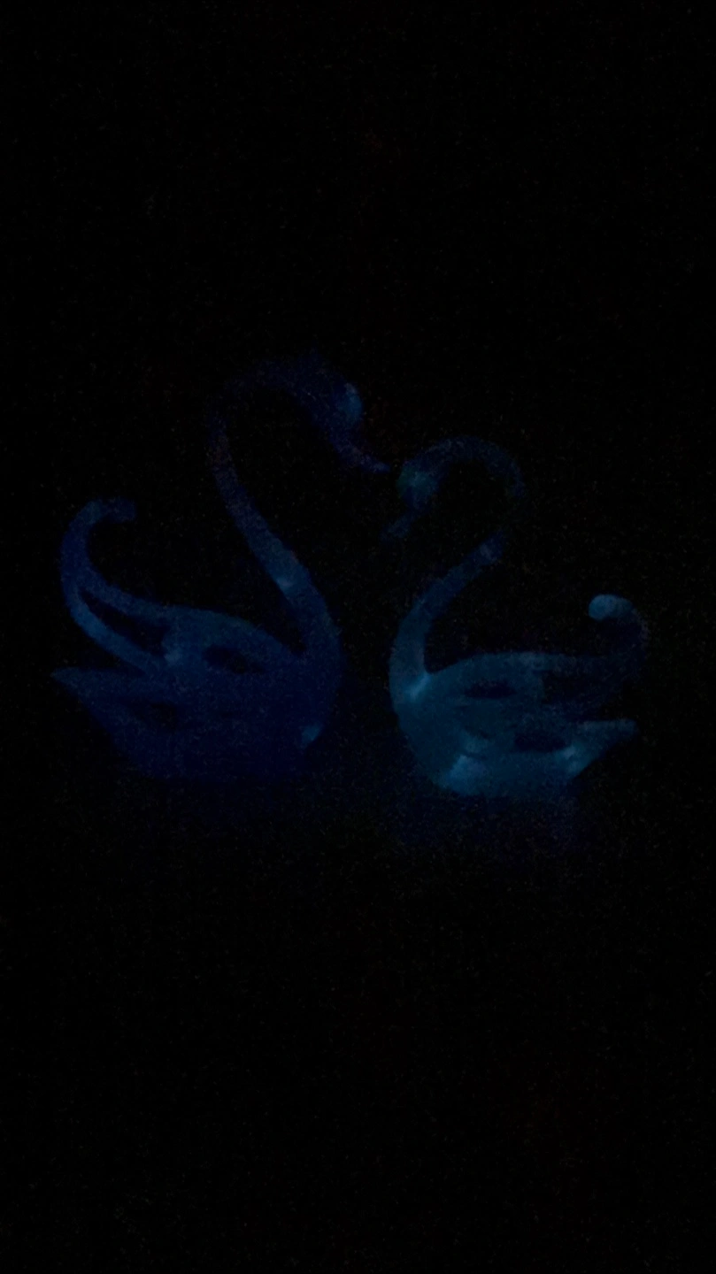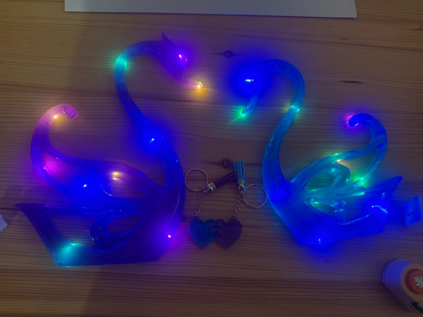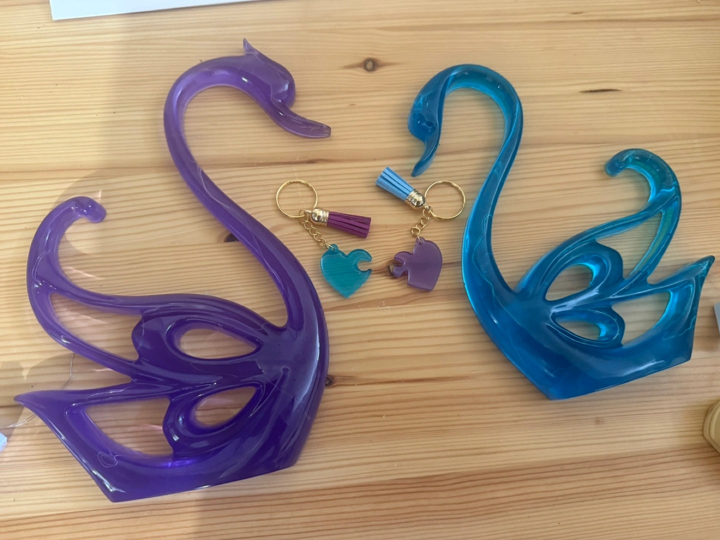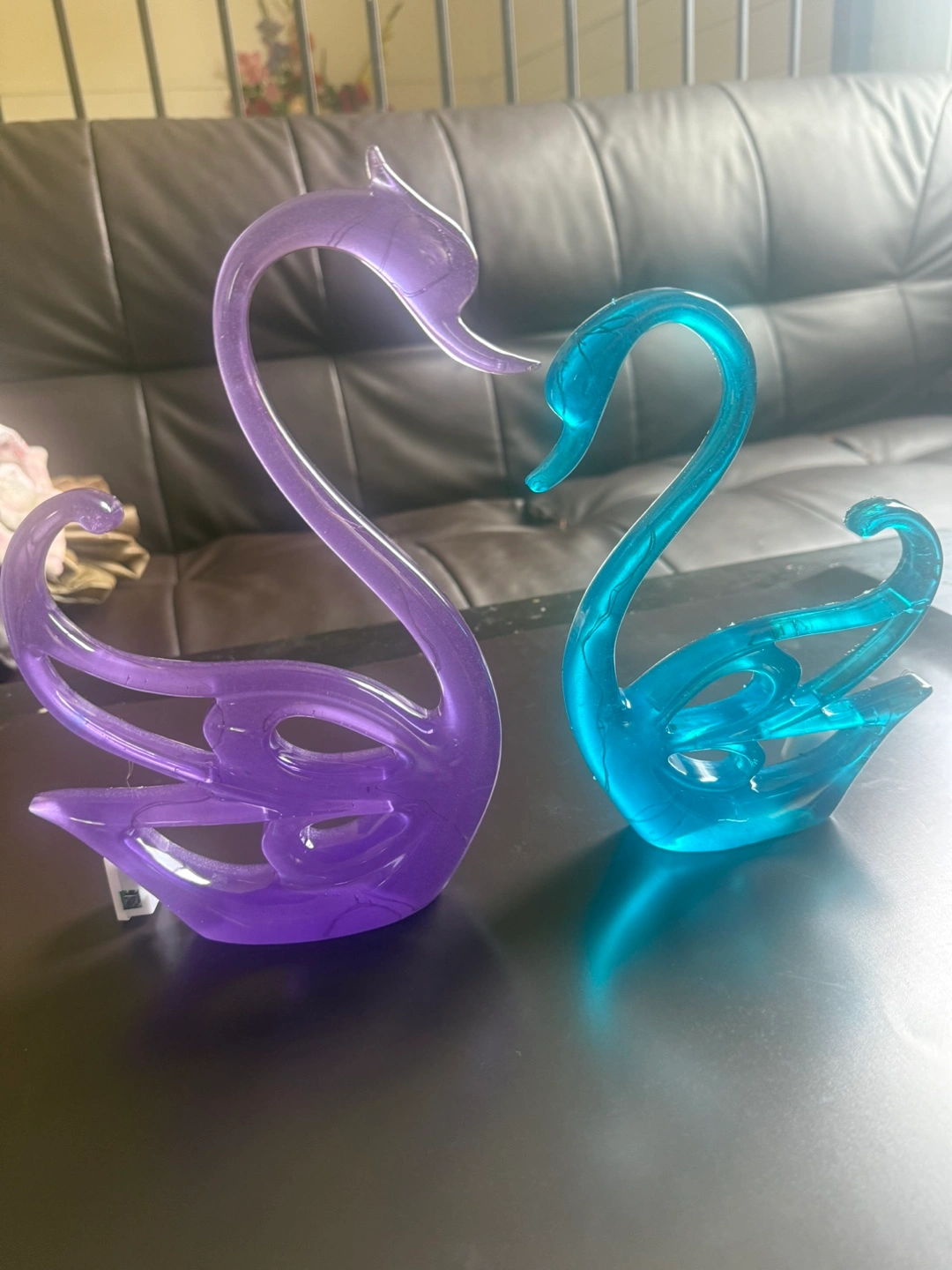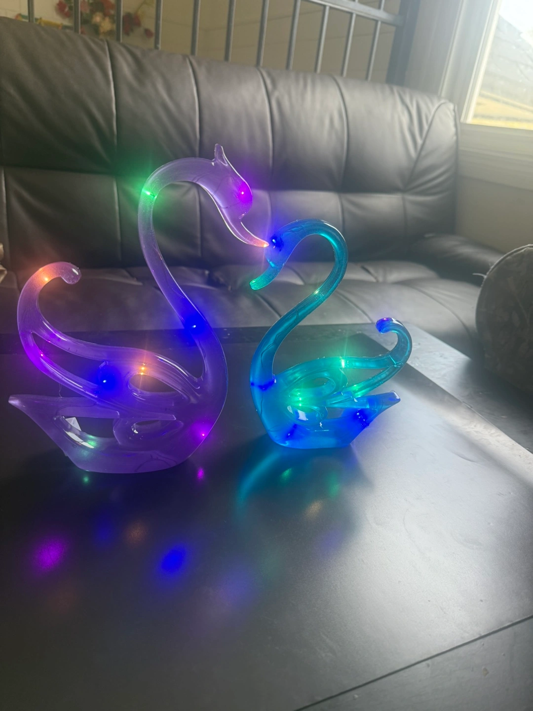 Two beautiful swan figurines. Purple and teal coloured. LED lights. Includes two matching heart-shaped keychains. Great Gift for Mothers Day!!! Price $65(set) Smoke/pet/bug free Home Pickup Louelda St near Concordia Hospital