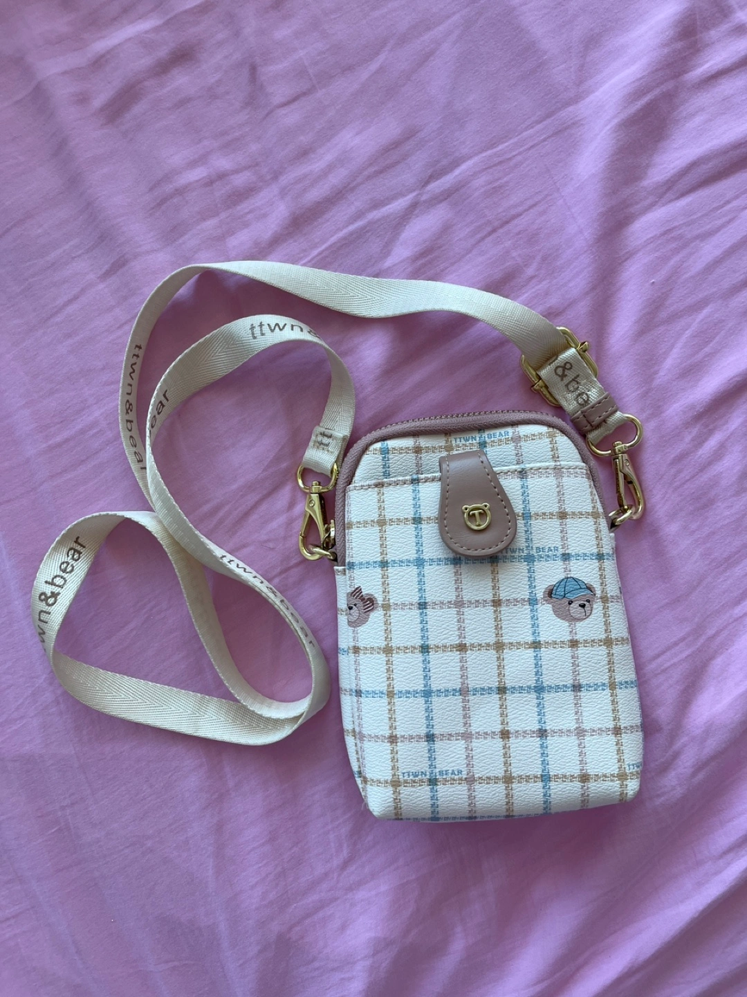 Adorable mini crossbody bag. Features a plaid pattern and cute bear designs. Comes with an adjustable strap. Perfect for everyday use.