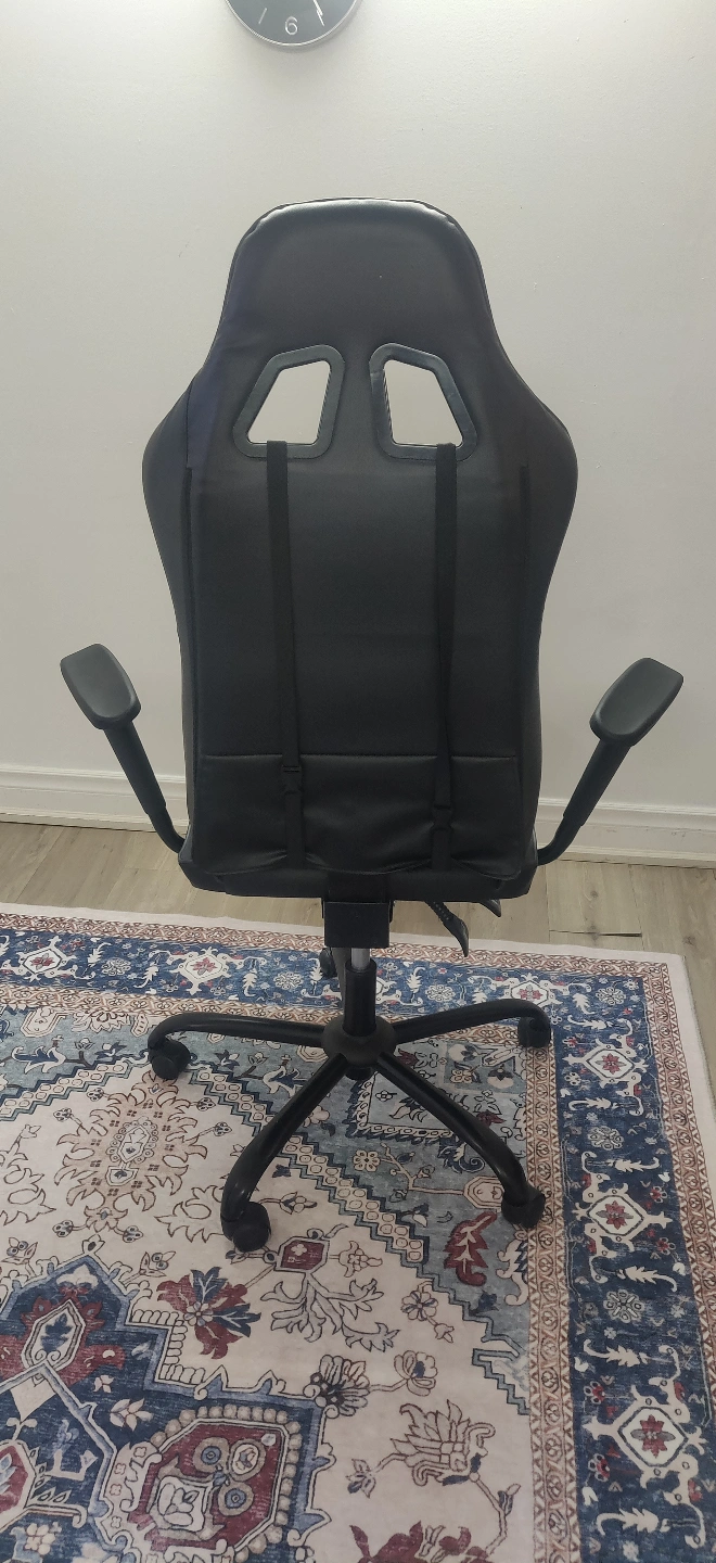 Black leather-like gaming chair. Features adjustable height isn't working, the chair reclines easily, armrests, and a built-in footrest. Very much comfortable and supportive for long gaming sessions or work from home.