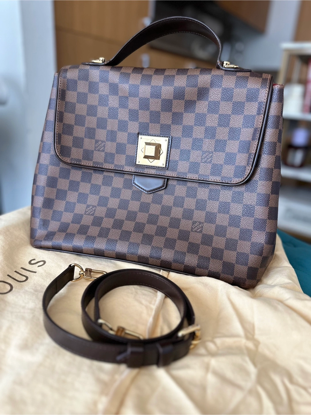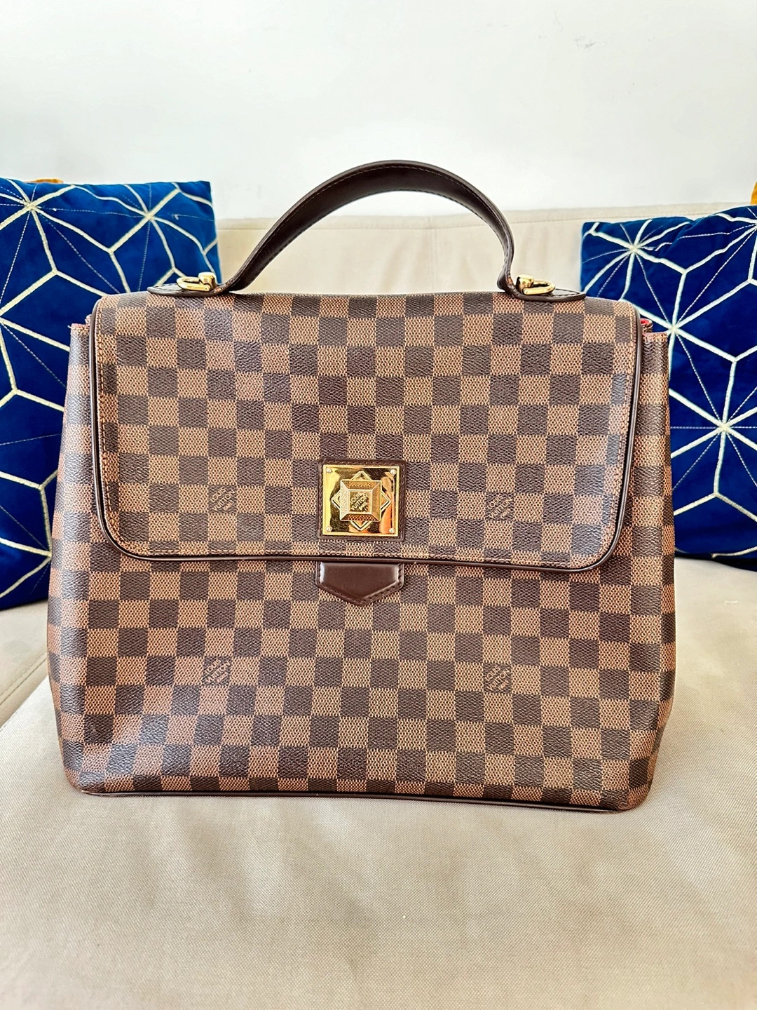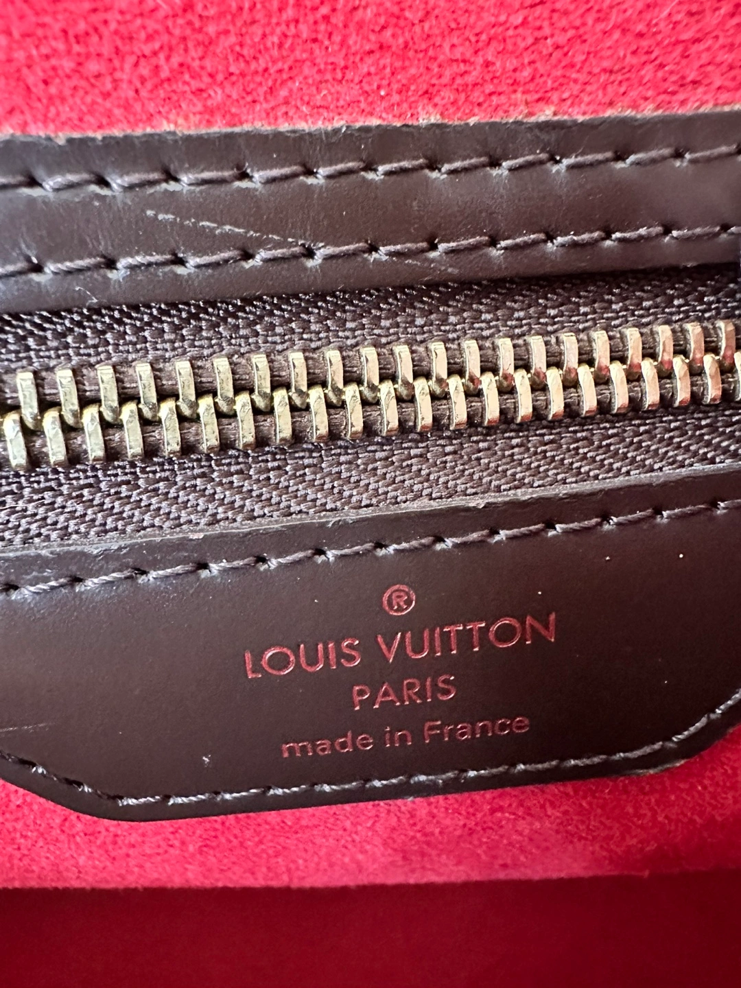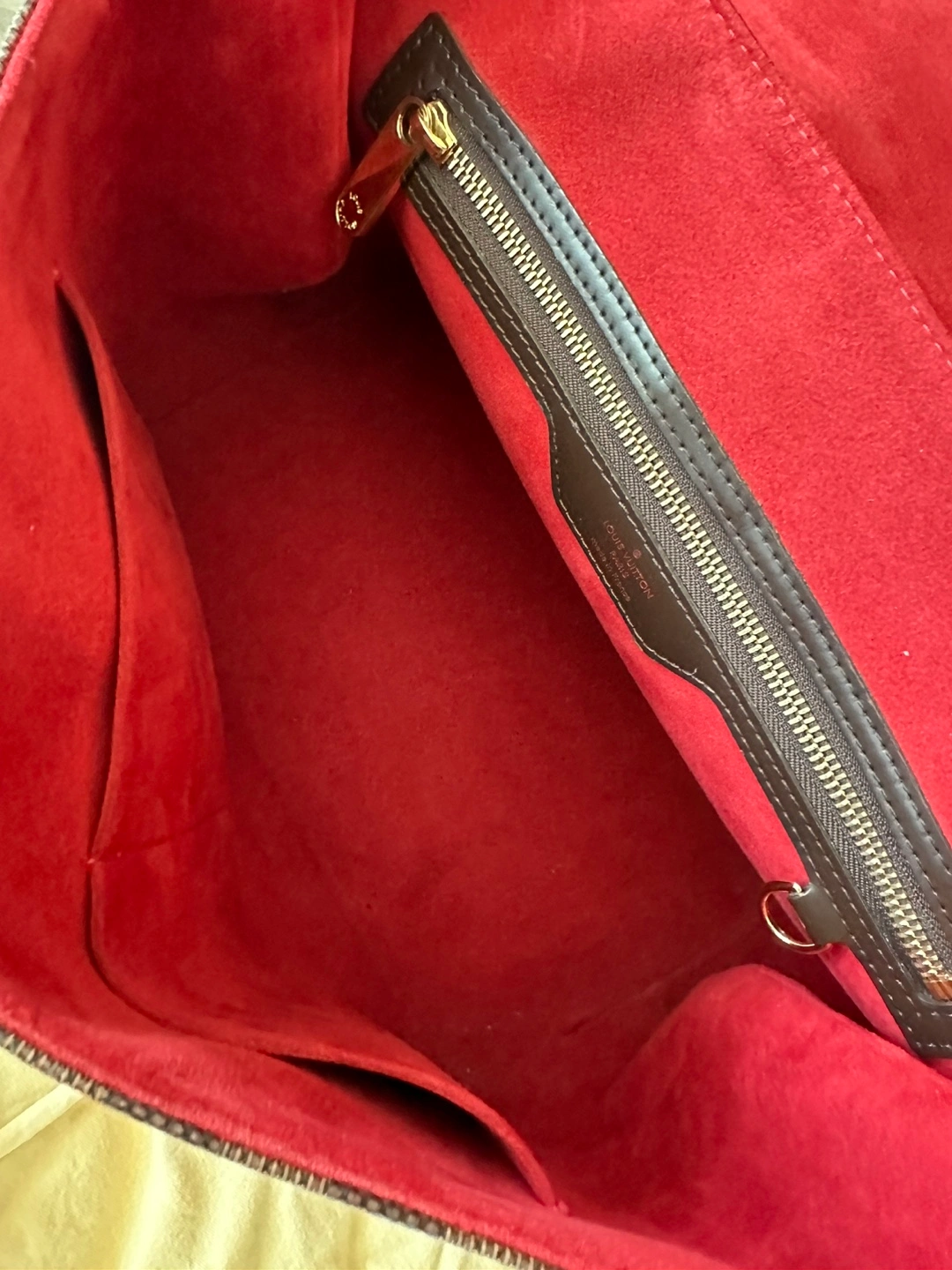 584Very exclusive and rare to find Bergamo GM handbag from Louis Vuitton. The handbag comes with shoulder strap and dust bag. The interior is very clean and the exterior is also good. Please see the pictures for reference. Width : 33 cm Height: 28 cm Depth: 20 cm Packaging : Dust bag Details - Overall Condition: Very good condition * Exterior Condition: Good condition * Interior Condition: Very good condition - Designer: Louis Vuitton * Material: Damier coated canvas with smooth chocolate leather trim - Origin: France * Production Year: 2011 * Date/Authenticity Code: FL4131 * Measurements: 13.25" L x 8" W x I|"H * Interior Pockets: One zip pocket, two flat pockets * Handles: Single leather top handle, adjustable leather shoulder strap - Handle Drop: 2.5" and 17.5" adjustable - Closure/Opening: Flap top with golden-brass turn lock * Interior Lining: Red Alcantara lining
