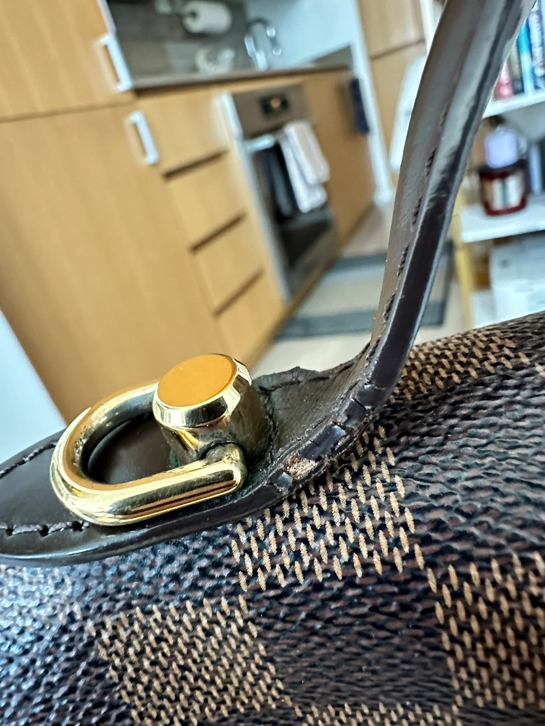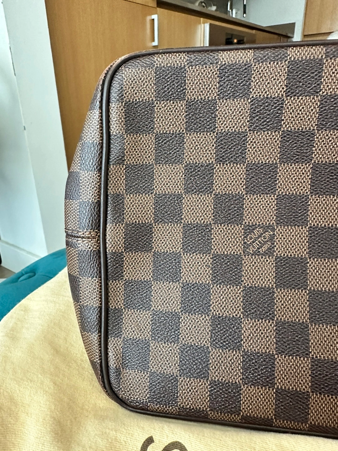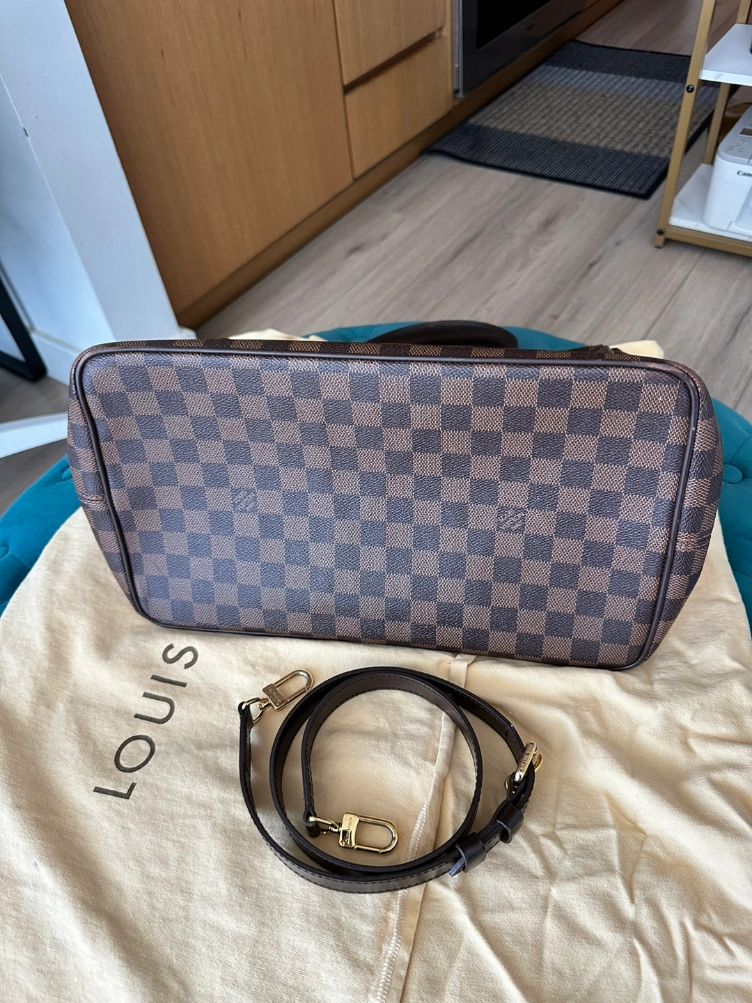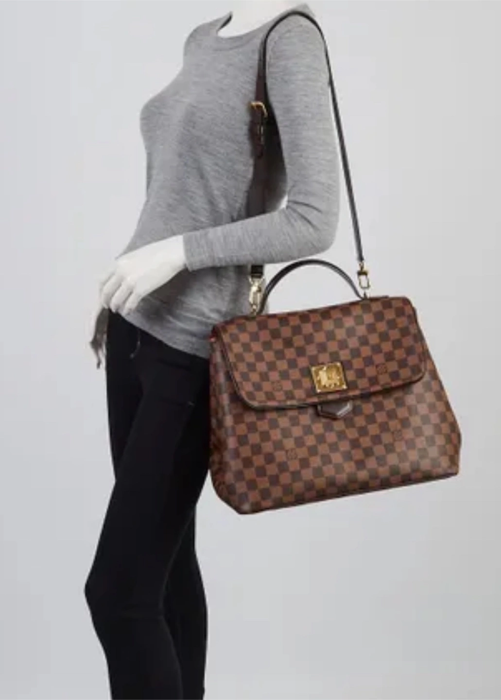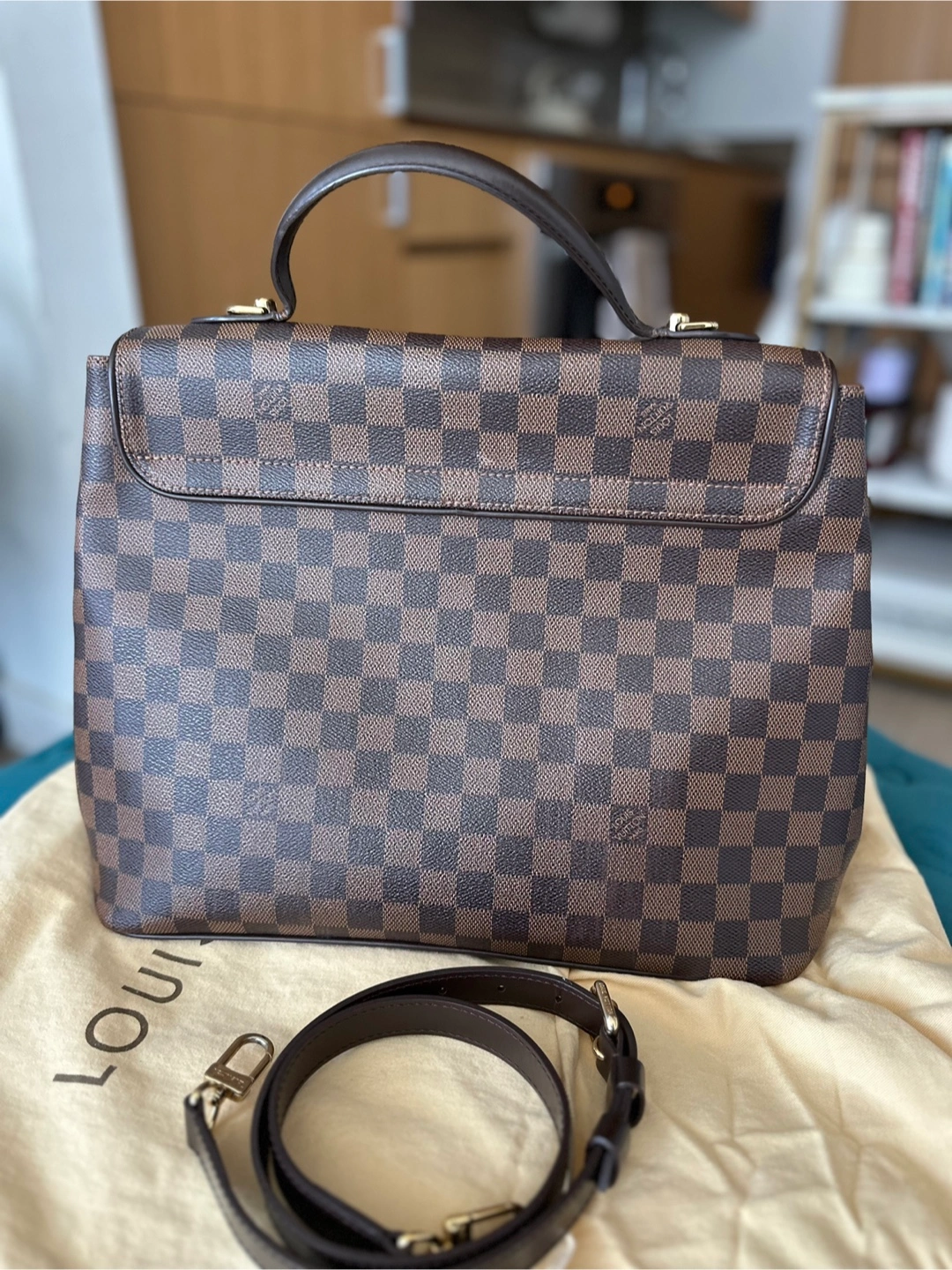 584Very exclusive and rare to find Bergamo GM handbag from Louis Vuitton. The handbag comes with shoulder strap and dust bag. The interior is very clean and the exterior is also good. Please see the pictures for reference. Width : 33 cm Height: 28 cm Depth: 20 cm Packaging : Dust bag Details - Overall Condition: Very good condition * Exterior Condition: Good condition * Interior Condition: Very good condition - Designer: Louis Vuitton * Material: Damier coated canvas with smooth chocolate leather trim - Origin: France * Production Year: 2011 * Date/Authenticity Code: FL4131 * Measurements: 13.25" L x 8" W x I|"H * Interior Pockets: One zip pocket, two flat pockets * Handles: Single leather top handle, adjustable leather shoulder strap - Handle Drop: 2.5" and 17.5" adjustable - Closure/Opening: Flap top with golden-brass turn lock * Interior Lining: Red Alcantara lining