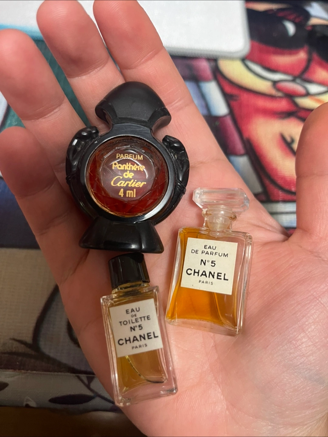 Three miniature perfumes. Chanel N°5 Eau de Toilette and Eau de Parfum. Cartier Panthère. Collectible sizes. Great for travel or sampling.