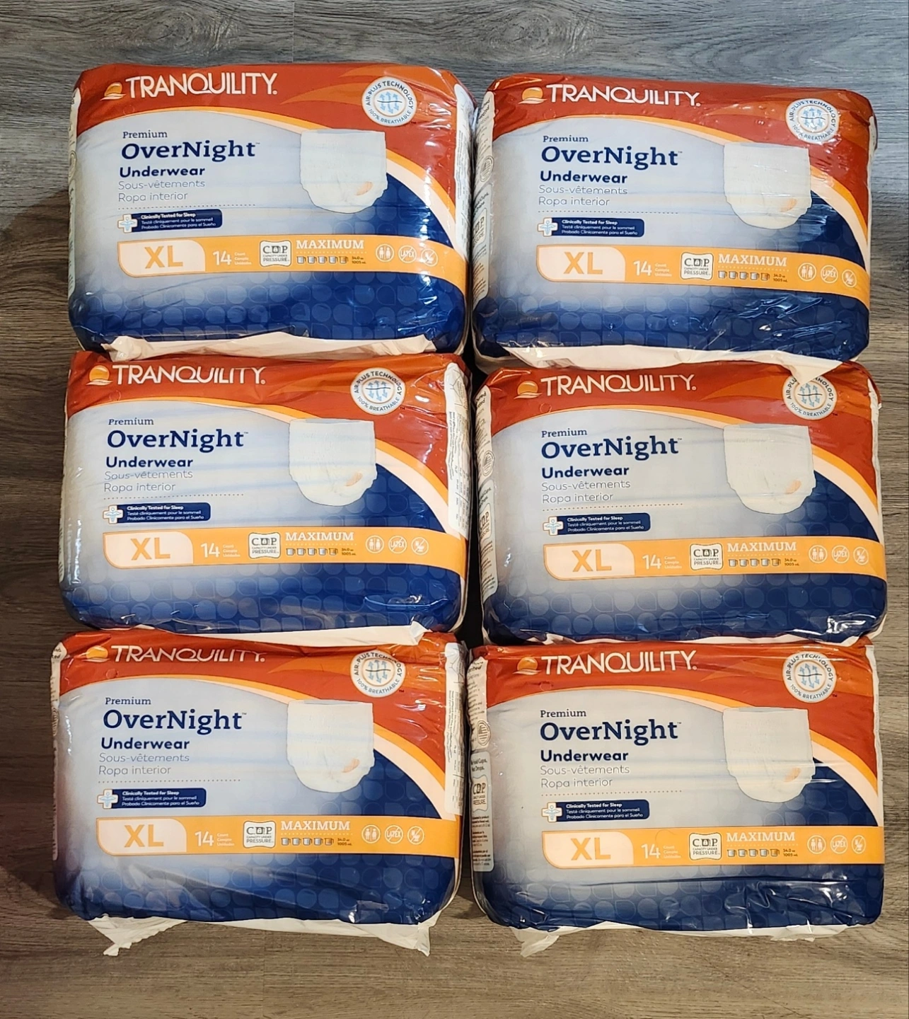 Six packages of Tranquility Premium Overnight Underwear. Size XL. Clinically tested for sleep. Maximum absorbency.