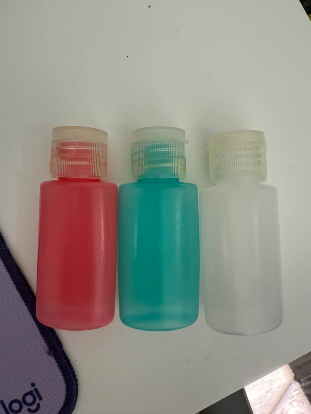 Set of three empty travel bottles. Various colours. Flip-top caps. Small and portable.