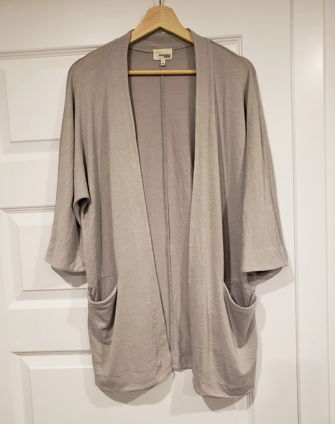 Lightweight Aritzia Wilfred grey cardigan. Three-quarter sleeves. Open front. Side pockets. Relaxed fit.