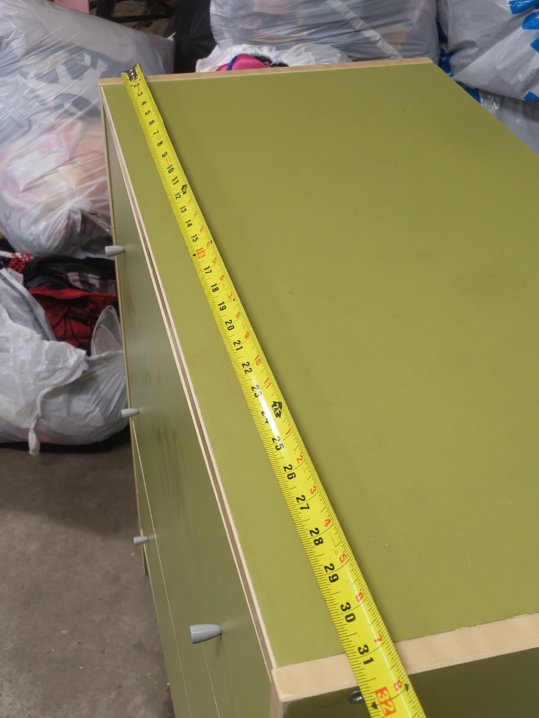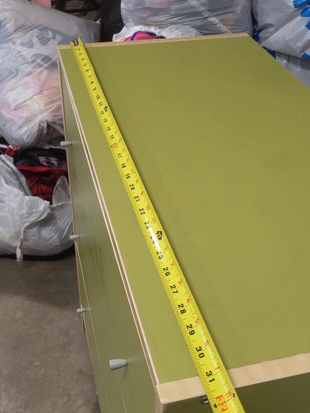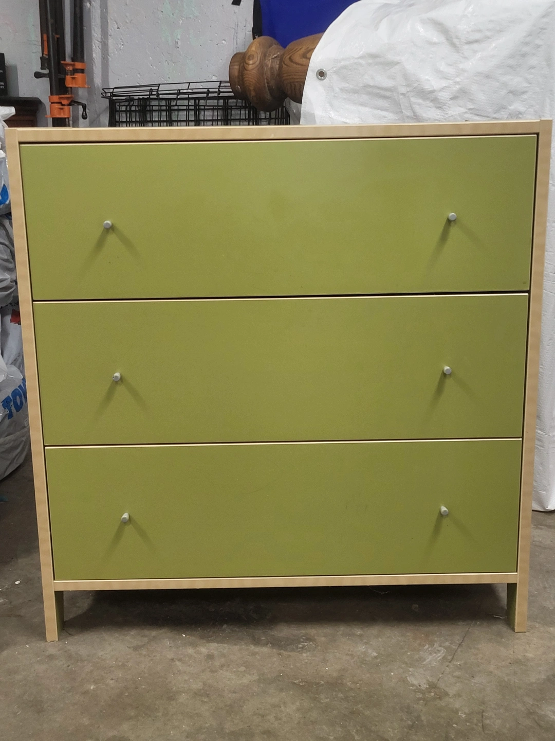 Three-drawer dresser. Olive green finish. Light wood trim. Simple silver knobs. Approximately 31 inches tall.