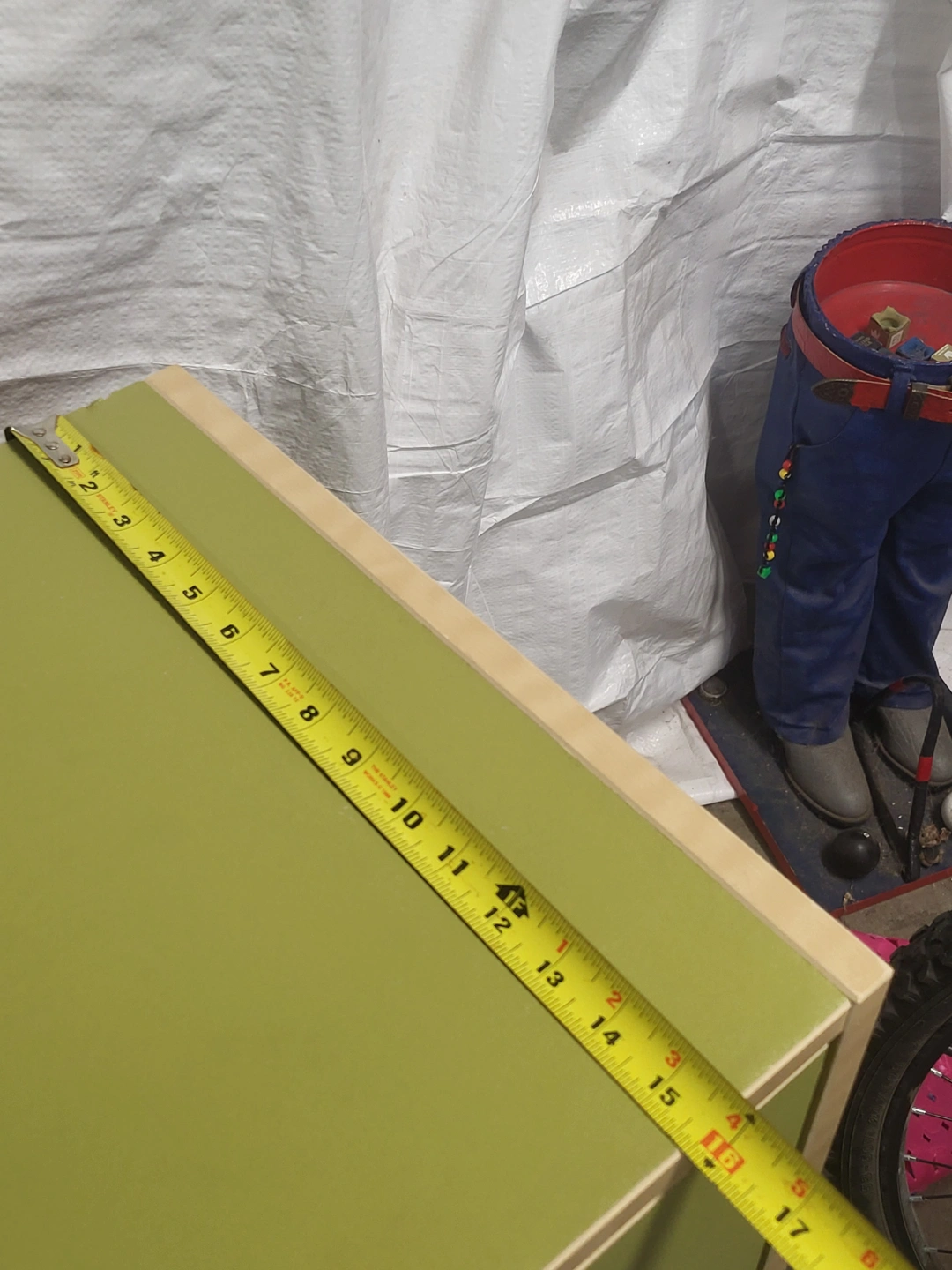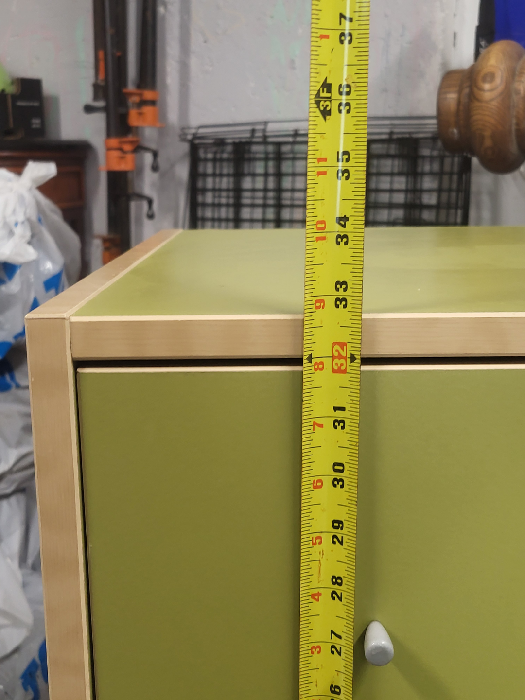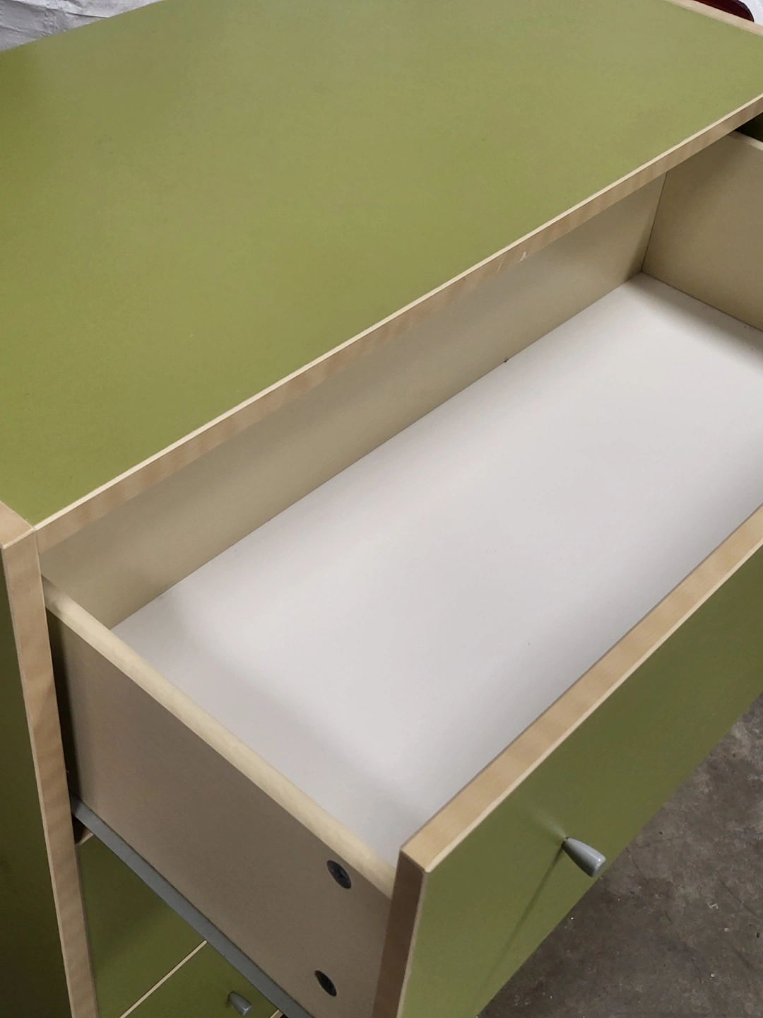 Three-drawer dresser. Olive green finish. Light wood trim. Simple silver knobs. Approximately 31 inches tall.