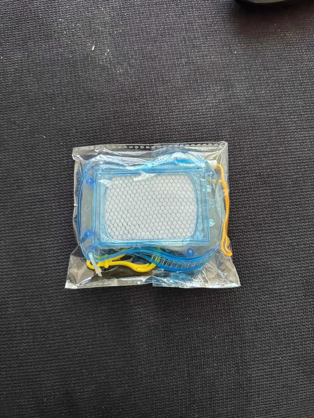 Small, handheld blue plastic toy. Features a drawing screen and a stylus. Comes in original packaging. Great for kids.