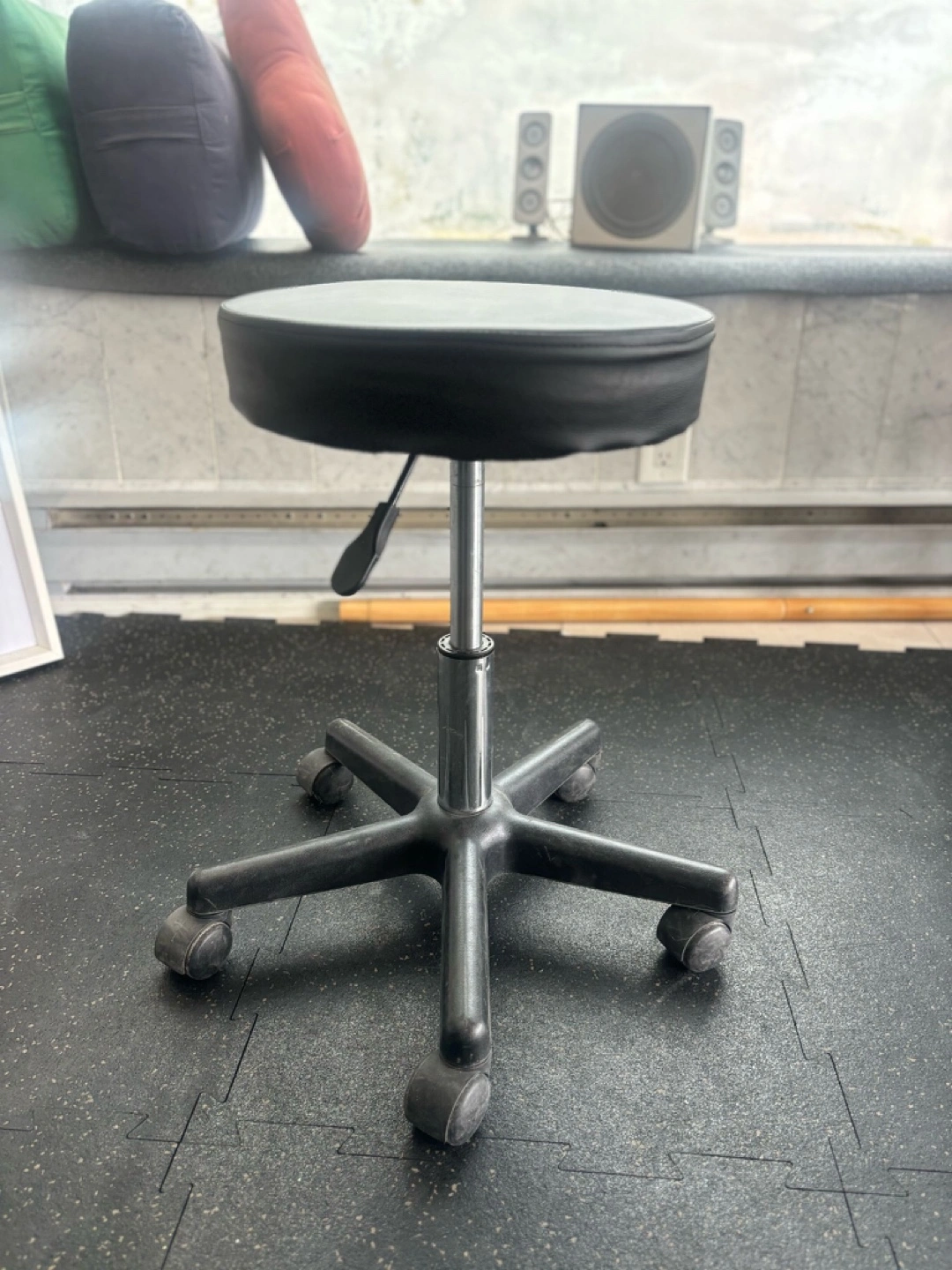 Black vinyl seat. Height adjustable. Five-star base with casters. Good for use as a drafting stool or small task chair.