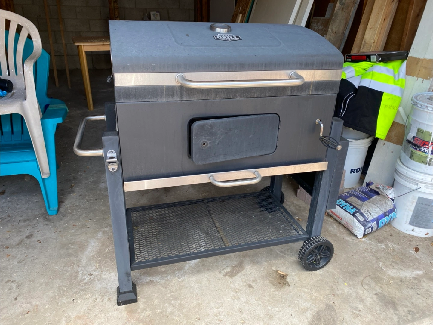 Large capacity charcoal grill. Metal construction. Features a bottom shelf and wheels for mobility. Shows some signs of use.